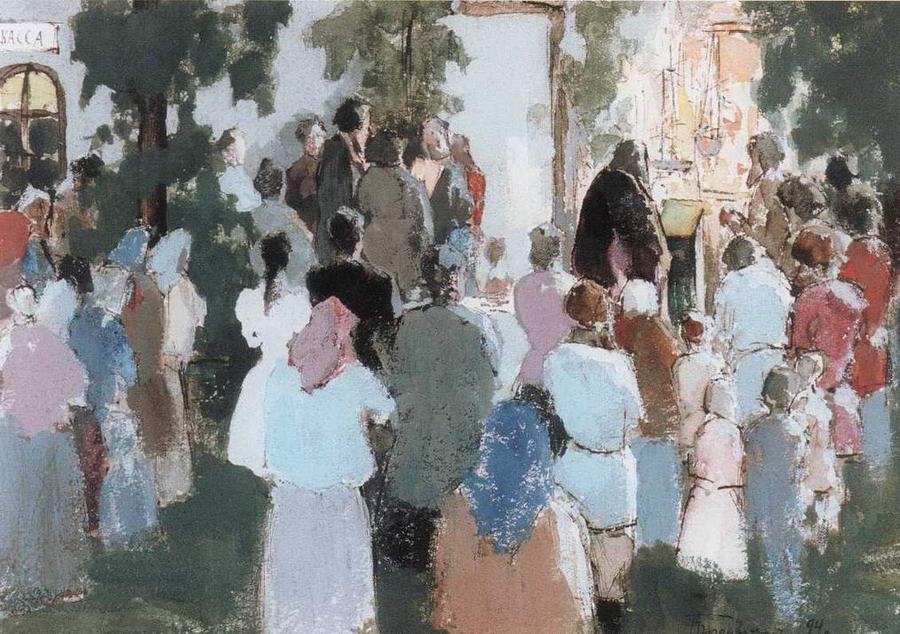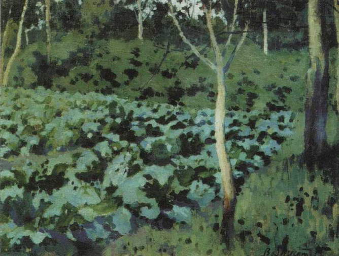 Лето 1894 года Борисов-Мусатов опять провел в Саратове. Там его постигло горе: умер отец. Тем не менее он много работал и привез в Москву массу гуашей, из которых следует выделить Молебен на станции железной дороги, где традиционный повествовательный жанр сменился поисками лаконичного цветового и графического решения, этюды маслом и картину Майские цветы. В настроении и пластическом воплощении некоторых гуашей обнаруживаются переклички с творчеством французских мастеров группы «Наби». Учитывая, что к этому времени русский мастер не знал «набидов», можно полагать, что такой протосимволизм ранних вещей Борисова-Мусатова обусловлен духом времени, когда литераторы и художники, уходя от позитивизма, почувствовали, что самая заурядная реальность может таить в себе и загадочную сторону[2 См.: ДВ. Сарабьянов. Борисов-Мусатов и художники группы «Наби». - В кн.: Д.В. Сарабьянов. Русская живопись XIX века среди европейских школ. М., 1 980.]. Как известно, импрессионистические и постимпрессионистические явления часто проникали в Россию почти одновременно, и это мы видим на примере работ Борисова-Мусатова 1890-х годов. Правда, в это время интерес к импрессионизму у художника явно преобладал, пример чему этюд Маки в саду, картина Майские цветы (обе - 1894). Из них наиболее интересен этюд Маки в саду. Солнечные лучи растворяют в себе растения, тени пишутся градациями голубого, лилового, синего. В этой работе усматривают знакомство с произведениями французских импрессионистов, считая, что Борисов-Мусатов мог видеть Стога Клода Моне на Французской промышленной выставке 1891 года в Москве. Возможно также, что репродукции с произведений импрессионистов показывала ему соученица по Академии художеств Марианна Веревкина[3 А.А. Русакова. Борисов-Мусатов, с. 27.]. Но нам кажется, что здесь налицо и влияние Константина Коровина.