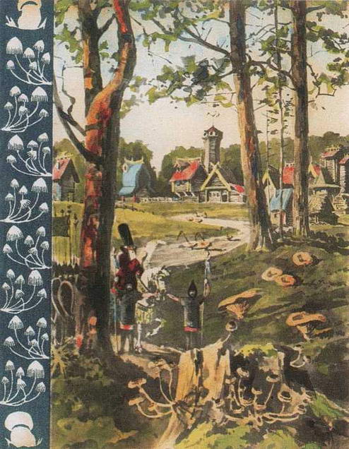 Внутренняя самооценка не подвела художницу: иллюстрации получились, действительно, «оригинальными и интересными», а грибы выглядят как одушевленные существа. На первой иллюстрации в лесной глуши, «под дубочком сидючи», на холмике, заросшем травой, красуется «царь грибной - боровик». Он восседает под древнерусским сказочным балдахином с резными колонками, с орнаментом из цветов и птиц на поперечной балке. А над всем этим возвышается голова языческого божества с круглыми выпученными глазами и с растопыренными, как у летучей мыши, крыльями, ушами и с покатой крышей вместо носа и лба. Царь-гриб, «на все грибы глядючи», повелевает на войну идти. Ему внимают разные грибы, рассыпавшиеся группками по холмику среди травы. На следующих двух иллюстрациях отказываются идти на войну «рыжечки - богатые мужички», «белянки - столбовые дворянки» и «волнушки - монастырские служки». Белянки-дворянки - два роскошных гриба, высокомерно выглядывающих с балкона богатого боярского бревенчатого терема с покатой, разноцветной, изразцовой крышей, возвышающегося над другими древнерусскими дворянскими постройками с шатрами, башенками и решетчатыми окнами. С высокого холма по узкой вьющейся тропинке, от ворот в башне монастыря с мощными стенами и блестящими куполами спускаются многочисленные волнушки - монастырские служки, не желающие идти на войну.