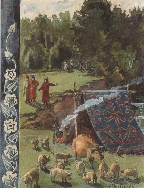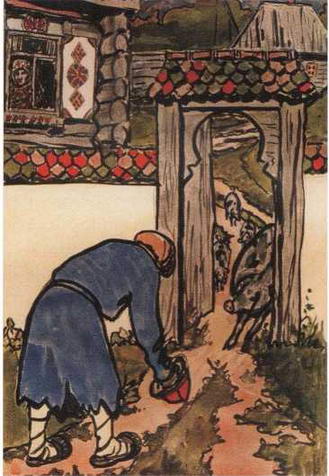 В сказке Злая мачеха старуха и день, и ночь донимала несчастную падчерицу. А как увез ее старик со двора, «соскучилась, в избе у ней стало тихо, на животе тошно, язык пересох». И приказала она старику: «Ступай, муж, за падчерицей, со дна моря ее достань, из огня выхвати! Я стара, я хила, за мной походить некому». В иллюстрации к этой сказке все лаконично, предельно обобщено, но выразительно, метко, точно в деталях: орнамент на столбе, резьба на перекладине открытой двери амбара, откуда видны очертания старинных палат, дивные орнаменты на юбках мачехи и падчерицы, спокойно клюющие просо куры. Также лаконичны и выразительны иллюстрации к сказке Отчего медведь стал куцый. Складный деревенский паренек на ремнях спускается с неба, а под ним - чудесный древнерусский деревянный город с резными крышами, куполами, башенками и флажками над ними. И над всем этим великолепием высоко в облаках парит стая птиц. А вот весна на болоте. Тонкие березки, прозрачная даль. На голове застрявшего в трясине паренька парочка уток свила гнездо, думая, что это кочка, и вывела птенцов. Неоперившиеся утята приглянулись огромному бурому медведю, склонившемуся над гнездом с жалобно кричащими птенцами и мечтающему полакомиться ими. Добрый паренек пожалел малых птенчиков и схватил медведя за хвост. Медведь шарахнулся в сторону и пустился в лес что есть духу, а паренек выбрался из болота с медвежьим хвостом на память. В иллюстрации к сказке Плутоватый мужик Поленова рельефно, сочно и достоверно изображает угол деревенской избы, огромную русскую печь, на которой сушатся расшитый платок и рубаха, и плачущее крестьянское семейство, расположившееся на лавке возле лохани. Чудесны резьба и орнамент богатого дома в иллюстрации к сказке Поклон плутоватого мужика свинье. А в иллюстрации к сказке Козлихина семья тесовые ворота северной крестьянской избы изукрашены такой же фантастической резьбой и орнаментом, как и рога у самой козы.