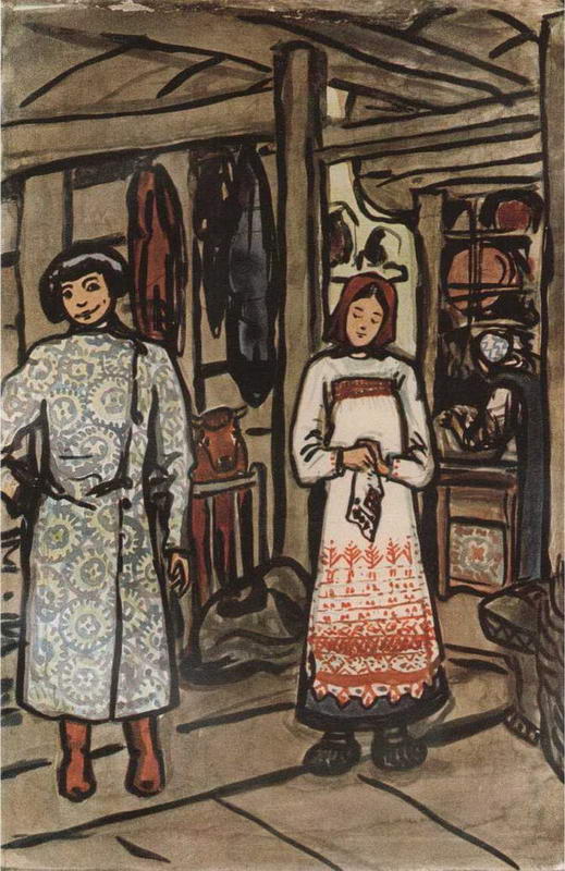 Эта трудоемкая работа отнимала у художницы много времени, но вместе с тем служила источником идей и вдохновения для собственного творчества. Поленова признавалась: «У Васнецова я не училась в прямом смысле слова, то есть уроков у него не брала, но как-то набиралась около него понимания русского народного духа». В.М. Васнецов был одним из тех художников, благодаря которому Поленова нашла свою собственную творческую дорогу в искусстве. Осенью 1884 года Е.Д. Поленова вместе со своим старшим братом организовала «рисовальные вечера» по четвергам и «акварельные утра» по воскресеньям. На московской квартире Поленовых, которую художники назвали «зимним Абрамцевом», стали собираться ученики В.Д. Поленова по Московскому училищу живописи, ваяния и зодчества, его товарищи и друзья. Здесь художники писали акварелью и маслом, рисовали карандашом и пером одетую или костюмированную модель, позировали друг другу, а главное - обменивались впечатлениями, мыслями, планами, поддерживая «абрамцевский» интерес к художественным национальным идеалам и поэтической народной традиции.