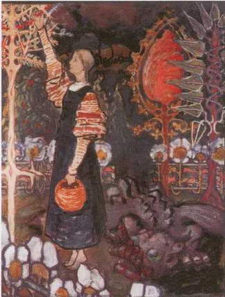 Любуясь красотой «поэтических уголков» родной природы, Елена Поленова пишет акварели, наполненные светлой радостью и трепетным восторгом. Поленова признавалась, что ухоженному барскому саду она предпочтет вольный уголок нетронутой природы. Но даже тогда, когда она пишет то, к чему когда-то прикасалась рука человека, изображение кажется нам первозданным. Таковы картины Старый сад. Заросли, Заводь в Абрамцеве и Подсолнухи. Тропинка на картине Старый сад. Заросли заросла густой травой и побегами молоденьких кленов, но зелень заброшенного, запущенного сада так свежа и благодатна, что манит углубиться в ее непроходимую гущу. Уголок подмосковного пруда на акварели Поленовой зарос осокой и камышом, но в его воде отражается и дрожит чарующая синева неба, а плавающие на поверхности воды крупные листья и желтые цветы кувшинок, или водяных лилий - царственно прекрасны. Картина Подсолнухи, написанная Поленовой маслом, притягивает и завораживает своей теплотой, жизнерадостностью и сочностью колорита. Великолепные, огромные соцветия подсолнечника с крупными желтыми лепестками, с созревающей темной серединой и бархатнозелеными листьями изображены на фоне покрытой соломой крыши, но кажутся первозданными. Дикорастущий подсолнечник завезен в Европу в 1510 году испанцами из Северной и Южной Америки. В нашу страну подсолнечник попал в XVIII веке. В 1833 году Россия первой в мире наладила промышленное производство подсолнечного масла путем отжима семечек. Но еще очень долго после этого в русских деревнях подсолнечник выращивался не только ради излюбленного лакомства - семечек, но и для красоты. Считалось, что цветы подсолнуха приносят здоровье, радость и счастье. Именно такими изобразила подсолнухи Елена Поленова. Высокие стебли подсолнухов на ее этюде закрывают другие цветы: белые бутоны и цветы астр, а еще ниже - оранжевые настурции и яркокрасные маки.