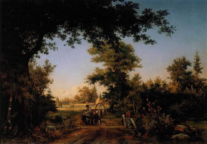Осенью 1865 года он приехал в Петербург, окончательно обосновался здесь, активно вошел в художественную жизнь столицы и стал в ней заметной фигурой. И.Е. Репин вспоминал, как на вечерах, собиравших художников, «громче всех раздавался голос богатыря И.И. Шишкина; как зеленый могучий лес, он заражал всех своим здоровым весельем, хорошим аппетитом и правдивой русской речью»38. Вполне закономерным было его прочное сближение с петербургской Артелью художников - хотя он и не был членом Артели, но регулярно посещал их знаменитые «четверги» и принимал участие во многих начинаниях. Одним из них стала подготовка литографированного альбома «Художественный автограф», издававшегося Артелью в 1869-1870 годах. Художники, успешно занимаясь литографией, обратились и к новому для России искусству офорта, в котором Шишкин уже преуспел и смог развить это свое искусство, ставшее важным направлением его творческой работы. Одним из значимых для Шишкина художественных центров Петербурга становится также Общество поощрения художников (ОПХ). Он общался с учениками Рисовальной школы ОПХ, с 1866 года участвовал в выставках и конкурсах Общества, в 1869 году стал одним из экспертов комитета ОПХ по оценке произведений, присылаемых на конкурс и присуждению им премий. Шишкин бывает в Москве, которая манит его воспоминаниями об Училище, встречами с друзьями. Летом 1866 года он работал на этюдах в селе Братцево под Москвой. Вместе с Л.Л. Каменевым, вспоминая свои этюдные сезоны в Швейцарии и Германии, он отдается здесь обаянию классического пейзажа средней полосы России. Этот летний сезон, по свидетельству друзей художника, был отмечен «страшной деятельностью» Шишкина и большим количеством написанных им этюдов39. Вдохновляющий вид русского поля в летний солнечный день воплотился в этюде «Полдень. Окрестности Москвы. Братцево» (1866) - предвестнике знаменитой картины «Полдень. В окрестностях Москвы». В другом этюде - «Дорога во ржи» (1866), поступившем в собрание Третьяковской галереи в 1994 году, Шишкин, используя горизонтальную протяженность холста (более 70 см), передает панорамные качества пейзажа в сочетании с увлеченной и тщательной проработкой цветов и травы на переднем плане.