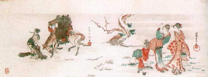 Ранние суримоно, изданные между 1793-1797 годами и подписанные Хисикава Сори, были, как правило, небольшими по размеру удлиненными карточками. Но уже около 1800 года мастер ввел в обиход длинные горизонтальные суримоно, подписанные им Такэдзин Хокусай, где стихотворные надписи, выполненные самим художником, равно как афоризмы и шутливые высказывания, отделялись друг от друга, занимая значительное место, а главными изобразительными мотивами были пейзажи, изображения птиц, цветов, плодов и насекомых, жанровые и лирические сцены. Большая часть пейзажных суримоно, таких, как Восход солнца, Зима, хотя и были построены по законам классической гравюры XVIII века, но уже отличались рядом новых черт. Люди в них не отделялись от природы, как на гравюрах Киёнага, а словно врастали в ее жизнь, всматриваясь вдаль, порой повернувшись спиной к зрителю и словно приглашая его войти в глубь пейзажной сцены и полюбоваться просторами вместе с ними. После 1805 года суримоно Хокусая вновь изменили свою форму. Они увеличились в размерах и стали почти квадратными. Их образы приобрели особую значительность и поэтичность, созвучную сопровождающим изображение стихам. В маленьких сценках художник сумел выразить глубокие и важные суждения о мире. Подчас его суримоно апеллировали к древним литературным образам, подчас говорили языком народной поэзии, вызывая в зрителях множество разнообразных чувств и ассоциаций. Так, о надвигающихся зимних холодах, о домашнем тепле и уюте рассказало новогоднее суримоно Женщина с вязанкой хвороста, хотя на гравюре не было ни изображения зимы, ни новогодних приготовлений, а показана лишь молодая крестьянка, несущая на голове вязанку хвороста. Хокусай намеком рассказал и о приближающейся зиме, напомнив зрителям о деревенском обычае отправлять в город в первые дни нового года девушек для продажи хвороста горожанам, чтобы им жилось тепло и уютно. Стихотворный текст, сопровождающий гравюру, дополнил ее содержание, создал с ней единый образ, рассказав о деревенской девушке - дарительнице радости: Фигура тонкая, как ива, В тумане легком Может раствориться.