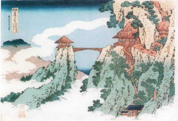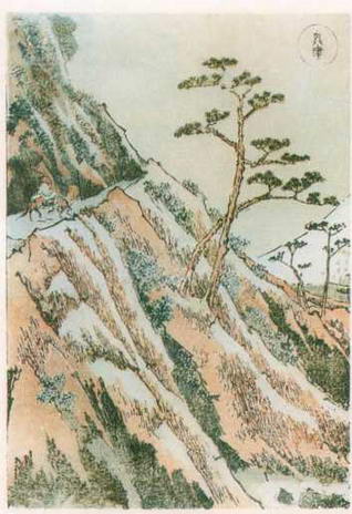 Двадцатые и тридцатые годы XIX века - период бурного расцвета таланта Хокусая, достигшего преклонного возраста, много пережившего, много испытавшего и умудренного опытом. Побывав во всех концах страны, предприняв в 1817 году поездку в Кансай - места, хранящие многие традиции старой японской культуры, посетив древние синтоистские храмы Исэ и насладившись видами императорской столицы Киото, он в 1825 году переправился на остров Кюсю. Накопив за время своих долгих путешествий множество впечатлений и запечатлев их в своей богатой художественной памяти, Хокусай воплотил их в серии пейзажей, посвященных Японии. Влечение художника к пейзажной теме имело глубокие причины. Они зиждились в самой атмосфере времени. Увлечение путешествиями по знаменитым местам, охватившее японцев еще задолго до Хокусая, стимулировало развитие жанра путеводителей, в которых фиксировались сведения о местных достопримечательностях. Ими, как правило, были показы постоялых дворов, ремесел, разнообразных питейных заведений, предназначенных для развлечения путников. В гравюрах, заполнявших подобные путеводители, природе отводилось весьма малое место. В творчестве Хокусая сохранилось восходящее к жанру путеводителей стремление к показу каждой местности через ее достопримечательности. Не случайно им еще в 1804 году был создан подобный тип путеводителя, показывающего раритеты Пятидесяти трех станций дороги Токайдо, где в основном преобладали жанровые мотивы.
