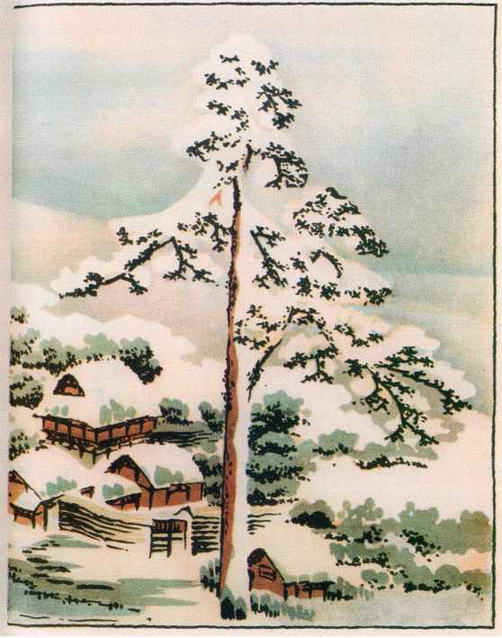 Не менее символичны и другие суримоно Хокусая, восходящие к середине 1780-х годов. Так, изображение ворона, несущего саблю, в гравюре Маленький ворон, рассказывало о достоинстве древнего аристократического рода, описанного в романе XI века Гэндзи моногатари, созданном писательницей Мурасаки Сикибу. Поэтому каждый предмет здесь не только символичен (сабля и ворон - синонимы, так как у героя романа Гэндзи сабля носила название «Маленький ворон»), но и отмечен особой изысканностью, декоративной утонченностью техники, колористическим разнообразием. Оперение ворона, например, передано сочетанием блестящей и матовой черной краски, а сабля в его когтях украшена яркими многоцветными узорами. В суримоно Хокусая изображение окружающего человека природного мира обрело не свойственную предшествующему искусству многозначность. Об этом говорит одно из лучших суримоно мастера, выполненное в начале XIX века, Луна, хурма и кузнечик (1807). Оно, как и другие его суримоно, немногословно. Огромный бледный диск луны, едва проглядывающийся на фоне сероватой бумаги, ветка, свисающая со старого корявого дерева, отягченная спелым желтым плодом хурмы, и зеленый кузнечик, приникший к нему, - то немногое, что изобразил художник. Но содержание суримоно намного шире. Оно рассказывает о красоте лунной ночи, о наступающих холодах и щедрости природы, дарящей свои плоды неимущим. Об этом говорит сопровождающее гравюру стихотворение: Свет осенней луны Мы встречаем вином Не счесть стаканов. А бедный кузнечик - Отведает ли сладкий сок хурмы? [1 Цит. по: Б.Г. Воронова. Кацусика Хокусай. Графика. М., 1975, с. 35.]