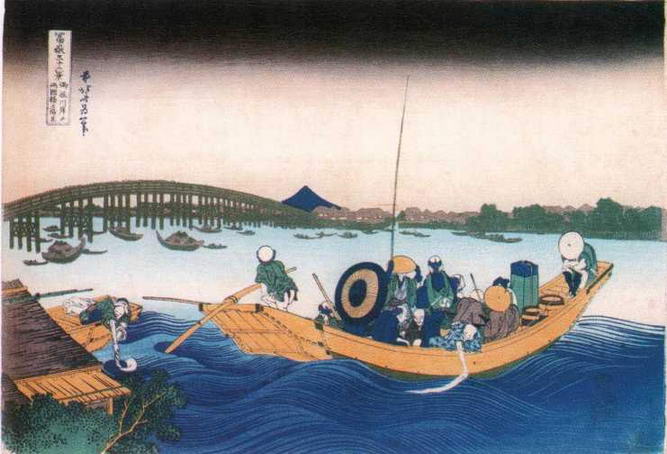 Большая часть гравюр серии Тридцать шесть видов Фудзи посвящена жанровым сценам, показу жизни городских ремесленников, поглощенных своим напряженным трудом. Их фигуры представлены на фоне пейзажа с неизменно выступающей вдали Фудзиямой. Мастер то приближал ее к зрителям, то отдалял, создавая новые пространственные эффекты, используя то восточную перспективу и глядя на пейзаж сверху вниз, то применяя западную линейную перспективу, понижая горизонт и уменьшая далекие предметы. Этим он достигал разнообразия акцентов, сосредотачивая внимание зрителей на том или ином мотиве и как бы совершая с ними путешествие. Помещая на первом плане людей, художник показывал их в постоянном движении, подчеркивал повседневность их действий. Люди, изображенные им, - обитатели ремесленных кварталов. Они грубы и нарочито некрасивы, движения их, показанные с предельной характерностью, демонстрируют напряженность их усилий. Они то тянут тяжелые сети, то пилят огромные бревна, то несут тяжелую поклажу. Но благодаря этому контрастному противопоставлению обыденности действий людей красоте природы идеи мастера приобретали особую убедительность. В постоянном присутствии спокойного силуэта Фудзи, то далекого и еле проглядывающего сквозь нагромождение досок, то отчетливо выступающего на горизонте, то занимающего большую часть листа, жанровая сцена смотрится как пейзаж и приобретает эпическую значительность. В листе Дровяной склад в Хондзё сцены городской жизни доминируют. Хокусай развернул перед зрителями широкую панораму предместья Эдо с его маленькими домиками, складами и повседневной суетой, кипящей вокруг лавки, торгующей лесом. Он использовал горизонтальный формат листа, чтобы полней представить зрителям повсеместно кипящую работу плотников, пильщиков и дровосеков. Он увидел особую красоту в изображении гигантского узорного куба, сложенного из дров и напоминающего крепость, в вертикально поставленных золотистых досках дровяного склада, в суете и целеустремленности действий людей, их энергии и активности, огромности предметов, их окружающих. Ритмы гравюры беспокойны, распиленные доски неровны и своими острыми концами словно упираются в небо, в гравюре нет центра, на котором мог бы сосредоточиться взгляд. Но вырисовывающийся вдали в просвете между торчащими досками ясный и светлый силуэт Фудзи придает всему городскому пейзажу новое звучание, заставляя зрителей ощутить единство повседневного и вечного, прозаически-конкретного и поэтического. Показывая единство и взаимосвязанность жанровых мотивов с пейзажем, Хокусай никогда не утрачивал ощущения красоты и значительности природы. Ее он подчеркивал и временем суток, и состоянием погоды, изображая то внезапный порыв ветра, то вечернее затишье, то неясность туманного дня, то закат солнца. Лист Закат над мостом Рёгоку Хокусай посвятил сумеркам. Он выбрал время суток, когда меркнут вечерние краски, темнее становится вырисовывающийся на блеклом фоне неба, окрашенный синевой силуэт Фудзи, и ажурными кажутся аркады деревянного моста. И хотя на переднем плане продолжает кипеть жизнь (стирает белье у причала прачка, качается в волнах лодка с нарядными пассажирами), все дышит вечерним покоем. Ощущение вечера, надвигающегося на столицу, передается мягкими переливами красок, темных в об