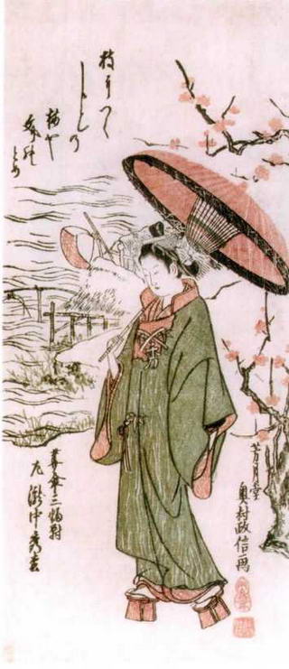 Элементы пейзажа, обозначающие место действия, достаточно рано появились в театральной гравюре. В гравюрах Тории Киёнабу (1664 - 1720) изображение ветвей и побегов растений были еще настолько фрагментарными, что не могли быть названы пейзажным фоном. Однако именно они положили начало развитию темы природной среды в гравюрах укиё-э. Создание первых полихромных гравюр («парчовые гравюры») связано с именем Судзуки Харунобу (1725 - 1770). Гравюры этого мастера характеризовались не только более глубоким и тонким раскрытием эмоционального мира человека, но и расширением круга тем, стремлением использовать цвет для выявления настроения героев, более широким и свободным использованием элементов пейзажа, включенных в общий эмоциональный строй гравюр. Судзуки Харунобу посвящал свои гравюры воспеванию поэзии будней, красоты и грации женщин. Но в изображение повседневных сцен он внес небывалые прежде ноты интимности и поэзии. Он первым сумел выразить интимное состояние своих героев через условные,тонкие и мягкие оттенки цвета и поэтически трактованные элементы пейзажа. Художником, равным по масштабу Харунобу, но принесшим в гравюру еще целый ряд новшеств, стал Тории Киёнага (1752 - 1815). Он принадлежал к династии театральных художников Тории, но по своему диапазону был значительно шире театральной темы. При помощи введения природных мотивов Киёнага в значительной мере раздвинул границы бытового жанра гравюры укиё-э и оказал сильнейшее влияние на многих последующих мастеров, таких как Утамаро, Эйси, Тоёкуни и молодой Хокусай.