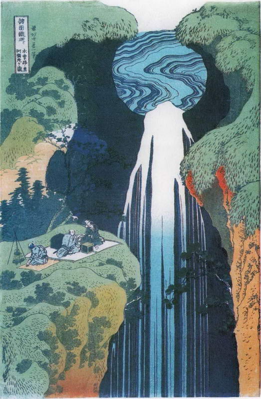 Цветом он давал зрителям возможность ощутить энергию и силу природных явлений, насладиться праздничной красотой и необычайностью открывающихся видов. Усиливая цветом впечатление реальности, он достигал более глубокого эмоционального эффекта. Все эти качества ярко проявили себя в серии, выпущенной следом за Тридцатью шестью видами Фудзи в конце двадцатых - начале тридцатых годов, носящей название Путешествие по знаменитым водопадам различных провинций (1827-1833). Работа над этой серией позволила художнику сосредоточиться на одном мотиве и рассказать на примере водопадов о ритмах и красках японской природы. Совершив большое путешествие по знаменитым своими водопадами местам, Хокусай задался целью запечатлеть особенности каждого из них, связать их облик с преданиями и легендами Японии. Так, водопад Ёсицунэ вызывал в памяти воспоминания о древнем японском герое, который обмывал в нем своего разгоряченного боевого коня, а водопад Амида напоминал своими очертаниями голову Будды. Такая конкретизация представлений о своей стране в плане осознания ее неповторимости и национального своеобразия не была новшеством в японской гравюре. Она намечалась уже в работах предшественников Хокусая, которые, создавая гравюры для иллюстрированных путеводителей, стремились прославить достопримечательности каждой провинции, через которую проезжали путешественники. Как правило, в них фиксировались сменяющие друг друга селенья, постоялые дворы, стоящие на проезжей дороге. Однако у Хокусая эта традиция приобрела новый, существенно отличный глубокий и духовно наполненный смысл показа удивительных красот природы, прославляющих родину. Хокусая поразила в водопадах их первозданная мощь и упругая сила, монументальность тяжелой массы воды, пробивающей себе дорогу в горном массиве. Каждый изображенный им водопад был наделен своей собственной энергией. Потоки воды, катящиеся с гор, в его гравюрах напоминали то могучие колонны, то тяжелые занавеси (Водопад Ёро в провинции Мино), то снежную лавину (Водопад Ёсицунэ в Ёсино), то узловатые корни старого дерева (Водопад Курифури на горе Куроками). Для передачи мощи водяных струй Хокусай использовал всего два цвета: белый и синий, придав каждому из них необычайную интенсивность. Эти цвета особенно отчетливо выделяются на фоне густой зелени, окружающей водопад Ёро, или рыжих скал, между которыми прорывается водопад Ёсицунэ. Нанесенные на бумагу мощными сильными обобщенными линиями мчащиеся синие струи воды, увенчанные широкими полосами белой пены, создают ощущение грандиозного, почти космического по масштабу движения, и только фигуры путников у подножия водопада, безмолвно созерцающих водяную лавину или спокойно обмывающих в струях воды водопада Ёсицунэ рыжего коня, превращают грандиозное действие в реальную жизненную сцену.