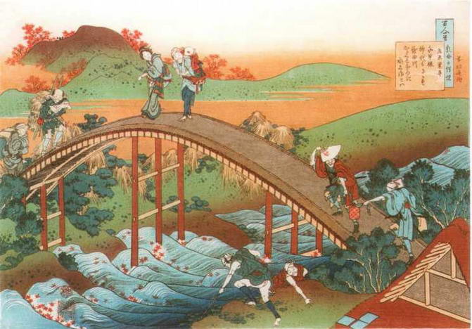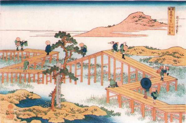 В 1827-1830 годах Хокусай создал серию гравюр, посвященную знаменитым японским мостам, и назвал ее Виды замечательных мостов в различных провинциях. Эта тема не случайно привлекла внимание художника и его последователей. Строительство новых мостов, предпринятое токугавскими властями в горной стране, изобилующей труднопроходимыми ущельями и реками, стало одним из важнейших событий времени. Легкие дуги арочных мостов, переброшенные через реку Сумидагава в Эдо, поразили воображение Хокусая, позволили ему по-новому взглянуть на город, а висячие мосты, перекинутые через ущелья в горных провинциях, открыли перед ним новые возможности изображения пространства. Соотношением разновеликих масштабов или смещением планов он усиливал ощущение глубины, приоткрывая мир с неожиданной точки зрения. Но Хокусай, прославляя новые мосты, заметно расширил границы своей темы, сумев через показ их разнообразного облика рассказать о жизни своей страны, ее праздниках, буднях, жизни города, величественных ландшафтах, горах и реках разных провинций. Ряд его гравюр, таких, как Висячий мост в Хиэцу-но Сакаи, или Мост обезьян, эпичностью строя близки серии Тридцать шесть видов Фудзи. Но в большинстве гравюр проявились уже новые настроения мастера. Его зачастую привлекали виды праздничного города (.Вечером в праздник фонарей на мосту Тэмма в провинции Сэтцу), показ ночных улиц и изогнутых деревянных мостов с рядами сияющих фонарей, освещающих ночную реку. Тягу к праздничному, нарядному и торжественному городскому пейзажу в известной мере пробудили в Хокусае появившиеся пейзажные серии Хиросигэ, начавшие в 1830-х годах выходить одна за другой, при-влекая внимание зрителей неожиданностью ракурсов и точек зрения, поэтической трактовкой городских видов. Хокусая тоже захлестнула волна восторга перед красотой праздничных городских пейзажей, но его философскому мироощущению значительно ближе был вдумчивый, эпический взгляд на природу. Лаконичный четкий стиль мастера тяготел к широким обобщениям, устранению второстепенных деталей.