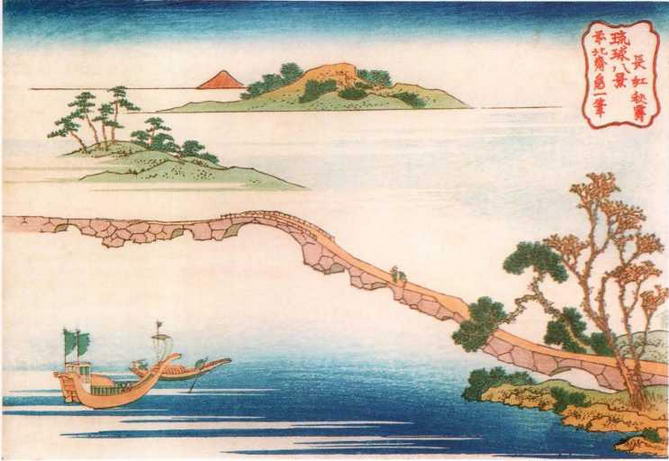 Тридцатые годы - время поисков и душевных волнений, принесших новые веяния в творчество Хокусая. Жизнь мастера протекала в далеко не легкое для Японии время, когда все острее ощущался надвигающийся кризис существующей государственной системы, а вместе с ним все острее становились попытки правящих кругов укрепить клонящуюся к закату феодальную систему. Периодически предпринимавшиеся правительством меры по запрещению всевозможных излишеств, мелочный контроль за работой художников, которым не разрешалось пользоваться более чем семью досками для печатанья цветных гравюр, ставили преграды на пути их творческой свободы. Нестабильности существования сопутствовала также общая тревожная атмосфера жизни в стране, постоянно вспыхивающие бунты крестьян и городских жителей. Все это не могло не оказывать влияние на душевное состояние мастера, в творчестве которого назревало смутное беспокойство и все чаще ощущалось чувство одиночества. Стремясь обрести душевный покой в поэзии, Хокусай обратился к мудрости китайской лирики и к традиционным сюжетам китайской и японской живописи. Постепенно отступая от эпической репрезентативности, ощущавшейся в его мощных пейзажных образах 1820-х годов, он по-новому пристально стал вглядываться в мир природы и искать в нем созвучия своему душевному состоянию. Восхищение природой приобрело у Хокусая новые оттенки поэтического восторга, любования и желания насытить глаза красотой, вблизи которой раскрывается человеческая душа, приобщающаяся к чуду заливающего весь мир серебристого лунного света или радостного весеннего цветения. Этот восторг особенно ощутим в гравюре Облако цветов. Ёсино из серии Снег, луна и цветы, где мастер создал живописную поэму, повествующую о весне. Он показал жилой квартал города, превратившийся в сказочный сад, скрытый белым облаком цветущих вишен, заполнивших все пространство до самого горизонта. Здесь исчезли характерные для него четкие линии, буйство красок выразило чувства мастера, ощутившего пьянящий аромат весны. Не случайно художник подписывал свои гравюры, выполненные в эти годы, Дзэн Хокусай Иицу, подчеркивая заложенное в них созерцательное настроение. И действительно, созерцательное настроение все сильнее звучало в творчестве уже немолодого и обремененного заботами мастера, мягче стала его живописная палитра, небольшие детали, введенные в пейзаж, внесли в него ноты интимности и лиризма. Так, в пейзажном листе Мост - радуга осенней порой, входящем в серию Восемь видов острова Рюкю, выполненную в тридцатых годах XIX века, картину осенней природы с желтыми деревьями на первом плане, длинной извилистой дамбой, уходящей по диагонали в глубь гравюры, оживляют фигуры двух путников, разглядывающих лодочки-драконы, качающиеся у берега. Они вносят ноту достоверности и разрежают монотонную неподвижность, словно спящей природы,исполненной ощущения глубокого покоя. Хокусай, никогда не посещавший острова Рюкю, создал по воле своей фантазии поэтическую живописную поэму о маленьких пустынных островах, затерянных в просторах океана.