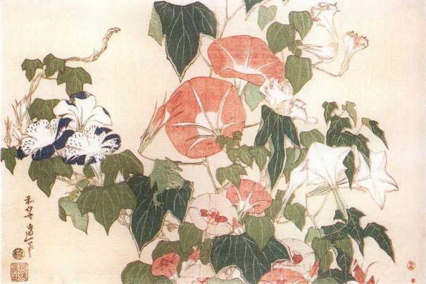 Таким мощным, значительным чувством проникнута созданная в конце 1820 - начале 1830-х годов серия, посвященная цветам родины. Возрождая в гравюре прославленный в живописи Дальнего Востока интимнолирический жанр «цветы-птицы», наполненный множеством поэтических ассоциаций и символических значений, Хокусай обратился к традиционному приему передачи через малую деталь природы всеобщих законов вселенной. Скрытую истину мироздания он обнаруживал в будничных явлениях жизни, стремясь в одном цветке почувствовать аромат луга. Однако и в этом насыщенном символикой и поэтическими ассоциациями жанре он сумел выбрать свой собственный путь, назвав новую серию Большие цветы и придав изображенным цветам оттенок силы и героизма. Цветы, представленные им, стали символами красоты и яркости жизни. Так, слива, расцветающая в заснеженных горах ранней весной, для него олицетворяла мужество, жизненную энергию, пробивающую себе путь сквозь житейские невзгоды, а хризантема с ее солнечными лучами лепестков, расцветающих холодной осенью, воплощала образ света, солнца, самой Японии. Хокусай монументализировал свои цветы, преднамеренно меняя зрительные масштабы, укрупняя образы и открывая мощь и огромность мира природы в каждом земном проявлении. Белые лилии, изображенные им на ярком синем фоне, напоминали легких птиц, создавали ощущение света и радости, темные лиловые ирисы свободным размахом широко раскрытых лепестков вызывали в памяти гигантских бабочек, маки притягивали взгляд своей бархатистой мягкостью, материальностью и монументальностью форм. В структуре каждого цветка он искал логику строения форм, воплощающих энергию развития и роста. В эти годы Хокусай видел мир в радостном сверкании красок, восхищался каждым порождением природы.