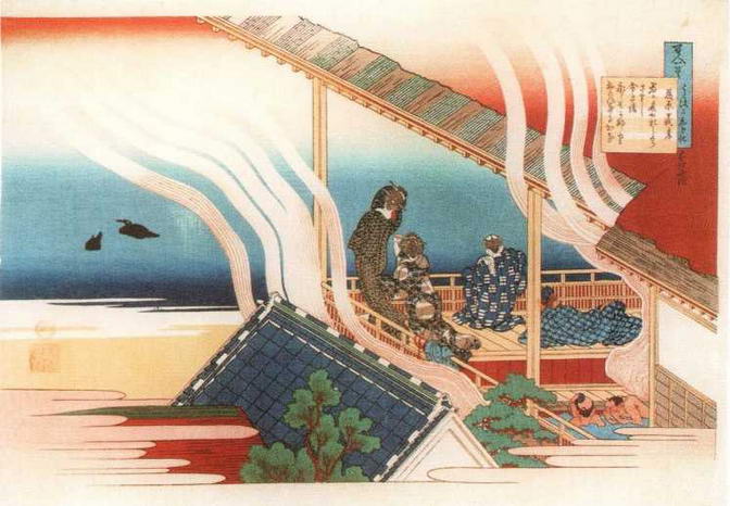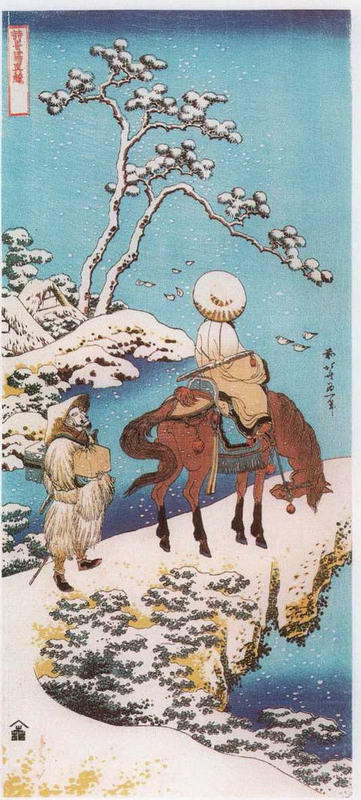 Стремясь обрести душевные силы в творчестве своих далеких предшественников и сопоставляя себя с поэтами-отшельниками Средневековья, Хокусай после долгого перерыва вновь обратился к иллюстрированию поэтических антологий и создал новую серию гравюр Поэты Китая и Японии. Духовный мир знаменитых поэтов ушедших эпох художник раскрыл через природу, поскольку именно она составляла главное содержание их произведений, определяла настроение действующих персонажей. Каждый из них в гравюрах Хокусая изображен либо восторженно созерцающим открывающийся перед ним прекрасный ландшафт, либо погруженным в печальные думы, одиноко путешествуя по горным тропам. Тема единства человека с природой превалирует в гравюрах этой серии. Сосланный на чужбину поэт и канцлер Накомаро изображен лежащим под сенью мощной сосны и пристально вглядывающимся в пустынные воды океана, страдая по далекой родине. Поэт Тоба представлен едущим в ссылку верхом на коне по пустынным заснеженным горам, сопровождаемый вьюгой. Он изгнанник, и его бесприютность подчеркивается суровостью зимней погоды. Поэт Ли Бо, бредущий с котомкой по горам, показан остановившимся перед мощным горным водопадом и на время забывшим свои невзгоды, залюбовавшись его красотой. Пейзаж помогает Хокусаю по-разному, но всегда глубоко и полно раскрыть душевный мир человека. Классические произведения поэзии прошлых эпох рождают в его душе новые настроения, мысли и чувства, приводят его к пониманию настоящего.