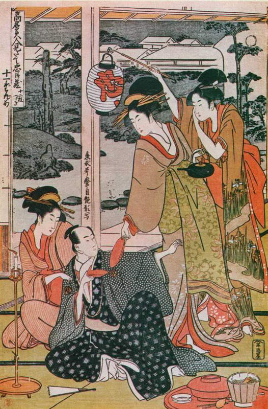 Японское общество периода Эдо (1614-1868) жило достаточно напряженной жизнью. Оно развивалось в условиях постепенно назревающего кризиса феодальной власти и связанной с ним жесткой и всесторонней регламентации жизни. Все новое отвергалось, все идеалы обратились в прошлое, все силы были направлены на сохранение традиций. В 1637 году правителем- сёгуном Токугава Иэмицу под угрозой смертной казни были запрещены всякие сношения с внешним миром. Порты Японии были закрыты для иностранных судов, выезд японцев за границу был также запрещен. Лишь за Нагасаки было оставлено право торговать с китайскими и голландскими судами. Все это порождало в среде горожан оппозиционные настроения по отношению к правящему воинскому сословию, выражавшиеся в частности и в области культуры. В японском искусстве XVII— XIX веков, сословно разделенном, ярко обозначились две основные тенденции, во многом противоположные друг другу. Одна была направлена на консервацию сложившихся на протяжении многовековой истории традиций, другая, зародившаяся еще в начале XVII века, была связана с выдвижением на историческую арену нового многочисленного торгово-ремесленного городского сословия. Быстро растущее, деятельное, богатеющее, оно жаждало заявить о себе, проявить себя в области духовной, создать свою философию и мораль, выработать свои эстетические принципы и традиции. Именно в среде так называемого третьего сословия - купцов, ремесленников, актеров и художников - постепенно сформировались силы, сумевшие встать на путь смелых открытий в искусстве, создать новые художественные формы, частично опираясь на традиции феодального периода, но насыщая их новым смыслом. Пришедшая на смену переживающей упадок средневековой живописи на свитках гравюра на дереве, отражающая жизнь и интересы горожан, стала вскоре значительным явлением национальной культуры. Круг тем, установившийся в творчестве художников- мастеров гравюры, был почерпнут из многообразной повседневной жизни столицы. Сформировался и стиль гравюры укиё- э, первоначально отражающий представления буддизма о жизни как бренном, быстротекущем потоке, но со временем получивший значительно более широкий смысл. В городской культуре Эдо - столице Японии, основанной правящей сёгунской династией Токугава в XVII веке, этот философский термин начал приобретать и другой оттенок, обозначив мир повседневной жизни, а затем и мир удовольствий и развлечений. Главной темой гравюры укиё-э стали актеры театра Кабуки и изображение красавиц-куртизанок из так называемых «веселых кварталов». При строгой регламентации жизни и постоянных ограничениях, которым подвергались горожане, «веселые кварталы» Ёсивара - района публичных домов - стали своеобразным оазисом, где характер общения и форма поведения горожан не были регламентированы и где они могли проводить время среди куртизанок, славящихся не только красотой, но и образованностью, изяществом манер, знанием поэзии и музыки.