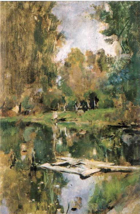 Картина Заросший пруд создавалась одновременно с Девушкой, освещенной солнцем. Первоначальное название картины - Сумерки. Этот пейзаж Серов писал, когда выдавались пасмурные дни и нельзя было работать над портретом Марии Симонович. Художник закончил его, лишь когда начали появляться желтые листья и летний вид сменился осенним. Пейзаж с похожим мотивом и таким же названием написан в 1879 году Василием Поленовым. Поленов, вместе с Саврасовым, был в русской живописи главным мастером «лирического пейзажа», посвященного «поэзии тихих уголков русской природы». Мягкий рассеянный солнечный свет, песчаная дорожка, приветливо «приглашающая» к прогулке по лесу, женская фигурка, примостившаяся на укромной скамейке в глубине картины, - все это создает у Поленова атмосферу мечтательной тишины, свойственной лирическому направлению передвижнического пейзажизма. Серов шутливо называл свой Заросший пруд «Добиньи-Руссо», указывая, таким образом, на взятый им совершенно иной образец пейзажной живописи (французские художники Шарль Добиньи и Теодор Руссо были характерными представителями барбизонской школы). Но характер живописи в серовском пейзаже не вполне совпадает и с указанным им самим «первоисточником»: пейзажи барбизонцев, с их световоздушным маревом, предвосхищали живопись импрессионизма; Серов же здесь (как и в Девушке, освещенной солнцем) гораздо ближе не к импрессионизму, а к Сезанну. Неподвижная, тяжелая, без малейшей ряби вода, напоминающая жидкую ртуть, кроны деревьев, словно впаянные в небесную твердь, - все кажется сотворенным из единой субстанции, словно оледеневшим или замершим в волшебном сне. «Вообще от картины веет каким-то безжизненным холодом», - заметил один из критиков. Это не уютный лес для прогулок и мечтаний, а чаща, которая могла бы окружать замок спящей красавицы, где ветви деревьев нельзя раздвинуть, а можно разве что разрубить мечом. Подобная сгущенная атмосфера «странного места» спустя два года будет с той же убедительностью передана Левитаном в картине У омута.