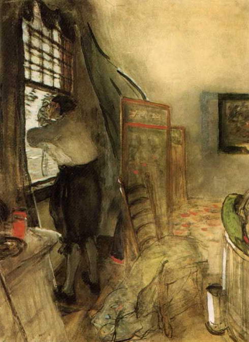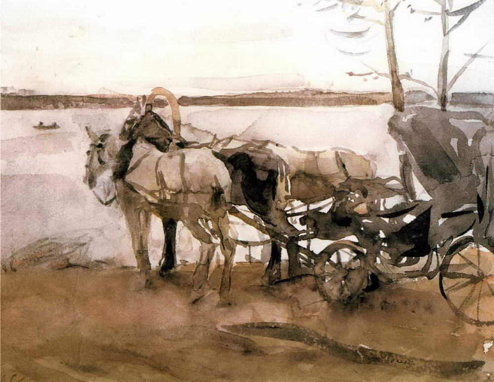 Фигура уснувшего мужичка в санях хорошо передает «человеческое отсутствие» в жизни природы, выражаемое Серовым. Это не столько «неласковая» природа. какой она видится, например, в этюдах Серова, выполненных на Севере, сколько природа, не обласканная человеческим вниманием и теплом. Роль настоящих жителей этих безлюдных пространств в серовских пейзажах отдана животным, главным образом лошадкам, как любовно называл их сам художник. Коровин рассказывал, как Серов, отдыхая в деревне, однажды приказал впрячь в телегу «опоенную» старую клячу и каждый день отправлялся на опушку леса писать с нее этюды. Удивленный крестьянин предлагал ему вороного коня-красавца, на что Серов отвечал: «Нет, эта лошадь опоенная мне больше вашего жеребца вороного нравится». Серов, конечно, мог вдоволь любоваться и писать породистых рысаков, чьими хозяевами были его аристократические заказчики, но ему в деревенских пейзажах нужны были деревенские савраски, живущие одной жизнью с той природой, которую он запечатлевал в своих этюдах. Животные Серова везде - и в парадных портретах, и в пейзаже - наделены удивительным достоинством, ощущением своей самодостаточности. В картине Финляндский дворик суетливость девочки- доярки контрастирует с фигурой серьезной и неподвижной коровы, терпеливо пережидающей «процедуру» дойки и словно ведущей степенную беседу с примостившимся рядом наблюдателем-котом.
