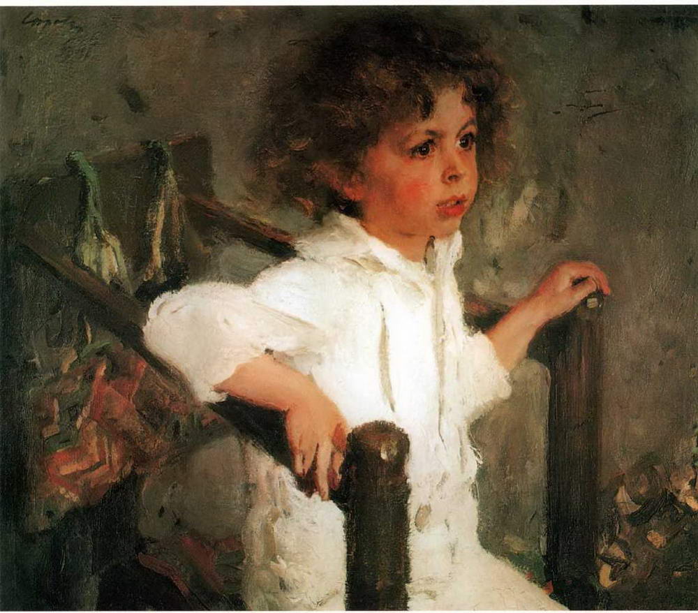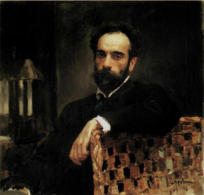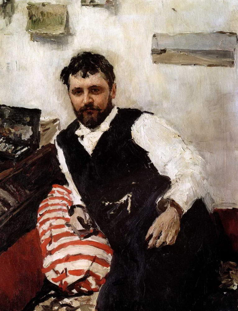 Именно так, «под Веласкеса», написан портрет итальянского певца Анджело Мазини, выступавшего с гастролями в столицах. Несколько утомленный, слегка капризный, вальяжный артист, одетый в черное, как аристократы на полотнах старых мастеров, снисходительно позирует молодому художнику. Портрет другого знаменитого тенора, Франческо Таманьо, где певец изображен в берете (артистический аксессуар), с гордо поднятой головой, вдохновенным взглядом, устремленным вдаль, мимо зрителя, выглядит этюдом для парадного портрета. Серов пишет голову Таманьо чуть снизу, как если бы он наблюдал певца, стоя у подножия сцены, на которой прославленный артист принимает аплодисменты публики. «А заметно, что у него золотое горло?» - спрашивал Серов, демонстрируя портрет (по свидетельствам современников, Таманьо обладал столь сильным голосом, что выступал, затянутый в корсет, чтобы не петь чересчур громко, а на его спектаклях дамы часто падали в обморок). Живопись портрета, горячая, золотисто-перламутровая, на просвечивающем красном подмалевке, оживляет воспоминание о колорите Рубенса и Ван Дейка. Портреты Мазини и Таманьо образуют пару, представляя собой вариации на тему «артист в жизни и в искусстве». Подобным же образом рифмуются два других портрета, выполненные в начале 1890-х годов - изображения художников Константина Коровина и Исаака Левитана. Серов как-то обмолвился, что хотел бы писать «одним движением кисти, как Костя Коровин». Портрет Коровина и написан таким образом, что заставляет вспомнить живопись самого Коровина. Он позировал Серову у себя в мастерской, среди раскрытых ящиков с красками и развешенных по стенам этюдов - художник в минуту отдыха. В портрете Левитана ничто не указывает на то, что изображен именно художник (хотя известно, что Левитан также позировал в своей мастерской). Серов здесь выбирает манеру письма, напоминающую портреты Крамского: сумрачный фон, коричневые тона, суховатая живопись. «Левитан был разочарованный человек, всегда грустный. Он жил как-то не совсем на земле, всегда поглощенный тайной поэзией русской природы», - пишет о своем друге Коровин. «Смуглое лицо с глубокими впадинами задумчивых, с тихой печалью глаз... Грусть его изящна. Каждый мазок на его этюде говорит о красоте души художника-поэта. И эта красивая тоска опьяняет вас, как аромат цветов», - вторит Коровину живописец Яков Минченков.