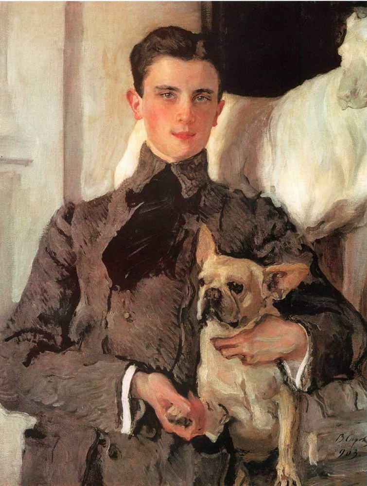 Один из первых в серии заказных парадных портретов - портрет великого князя Павла Александровича, дяди императора Николая II, удостоенный Grand Prix на всемирной выставке в Париже в 1900 году. Павел Александрович «хорошо танцевал, пользовался успехом у женщин и был очень интересен... Беззаботная жизнь кавалерийского офицера его вполне удовлетворяла,и великий князь Павел никогда не занимал ответственного поста», - писал о нем один из членов императорского дома. В портрете чопорная поза великого князя натянута и скованна - он застыл, выдерживая эту позу с чрезмерным старанием, точно не уверенный в том, правильно ли он это делает. Фигуру князя обрамляет свободно развернутый в пространстве корпус лошади. Ее морда обращена к зрителю, а стоящие торчком «чуткие» уши придают ей выражение пристальной, настороженной внимательности. Лошадь деликатно переминается с ноги на ногу, словно в нетерпеливом ожидании и недоумении относительно непонятной задержки своего хозяина, почему- то надолго впавшего в остолбенение. Часто присутствующие в серовских портретах животные - комнатные собачки или лошади - это не только дань традициям европейского парадного портрета, каприз заказчика или атрибуты модного интерьера. Присутствие «естественных» животных обостряет напряженную искусственность ситуации, которую сочинял своим моделям Серов - животные, не умеющие позировать, становятся «мерой человечности» изображенных на портрете людей. Крошечная левретка в портрете Софьи Боткиной едва заметна среди затканной золотыми цветами синей обивки дивана и желтого платья хозяйки, также покрытого искусственными цветами. При первом взгляде на портрет собачка выглядит еще одним цветком. Но ее «выдает» взгляд - она с любопытством косит глазом на зрителя, с удивлением обнаруживающего одушевленное существо среди этого тряпичного великолепия. Оживленное копошение собачки контрастирует с безразличным взором «скучающей барыньки», как отзывался о Боткиной Серов. Критика немедленно окрестила этот портрет «дамой на диване в пустыне», а когда Грабарь поинтересовался, отчего Серов сдвинул фигуру на край дивана, вопреки требованиям гармонической симметрии, художник ответил: «Так и хотел посадить, чтобы подчеркнуть одинокость этой модной картинки, ее расфуфыренность и нелепость мебели. Не мог же я писать этот портрет с любовью и нежностью». Среди амбициозных и капризных клиентов Серов редким исключением являлось семейство Юсуповых. В письмах Серов неизменно отмечает чуткость, любезность князей и княгини. В 1900-1903 годах Серов пишет их портреты, которые сразу были высоко оценены современниками. Среди этих портретов многие считали лучшим портрет младшего члена семьи - графа Феликса Сумарокова-Эльстона, унаследовавшего после гибели на дуэли старшего брата и смерти отца титул князя Юсупова.