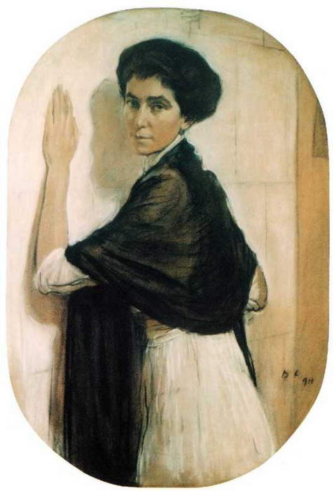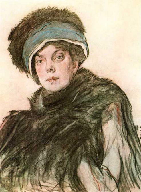 Это вечный парадокс актерства - актер отдает свою плоть, себя для чужих образов, и они срастаются с ним. Именно эту ситуацию, в сущности, инсценировал Серов в своем портрете, совместив впрямую персонально-характерное и имперсонально-стильное в очерке восточного рельефа. Но живой человек на этой парадоксальной грани между «сном искусства» и «театром жизни» оказывается беззащитным, «голым» - и это самая пронзительная нота портрета. В том, как Ида одновременно смотрит и не смотрит на зрителя, как она, как будто просыпаясь от «каменного» сна, поворачивается изнутри этого камня и, словно застывая в повороте, вновь уходит в каменную плоть, - удивительное ощущение хрупкости, ранимости и беззащитности. И то обстоятельство, что очерк зеленой шали, опутывающей ноги танцовщицы, похож на силуэт змеи,напоминает о том, что это предсмертный час, Клеопатра со змеей (отмечено Г.Г. Поспеловым). В портрет оказывается вписана, как бы невзначай, тема смерти, последнего мгновенья; поэтому взор Иды Рубинштейн получает характер предсмертного прощания - это взор, посылаемый в мир человеком, который в следующий миг обречен превратиться в изваяние,взор в сторону почитателей, которые сделали Иду беззащитной, возвеличив ее в качестве эмблемы, кумира современного эстетства.