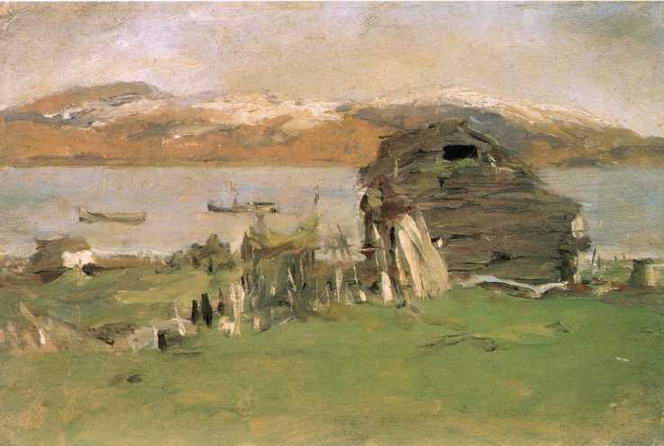 Но даже в этой простоте всегда предполагается взгляд наблюдателя, который, представляя себя внутри пейзажного пространства, в зависимости от мотива (будь то подтаявший под березкой снег, уютный дворик или ширь полей) радуется, печалится или умиляется, или ощущает патриотическое воодушевление («природа, предназначенная для богатырского народа»,- писал о пейзажах Шишкина Стасов). Так вот, первая тенденция русского пейзажизма доводится Серовым до предела «безэффектности», потому что эффект производить не на кого - не предполагается вообще наличие в природе способных впечатляться обитателей: ни трепетно-чувствительных, открытых всему прекрасному «граждан мира», ни тем более патриотически настроенных аборигенов. Пейзажи Серова пустынны. Дороги и тропинки, зимние, осенние, в серовских пейзажных этюдах выглядят забытыми - по ним давно никто не ходит и не ездит. И поэтому когда из-за покосившегося сарая мы видим выезжающие сани, запряженные лошадкой {Зимой), то это происходит как бы вдруг, после долгого скучливого ожидания и всматривания в белый снежный покров, - и это появление заставляет встрепенуться и даже обрадоваться бегу лошадки, как долгожданной вести и свидетельству, что здесь еще происходит какая- то жизнь.