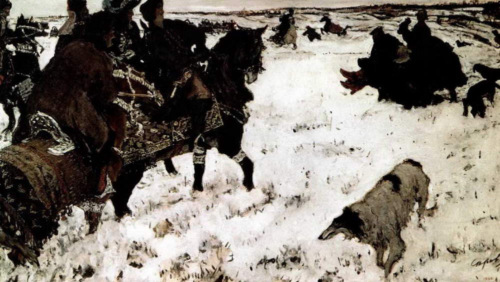 Петр II и цесаревна Елизавета Петровна на псовой охоте. 1 900