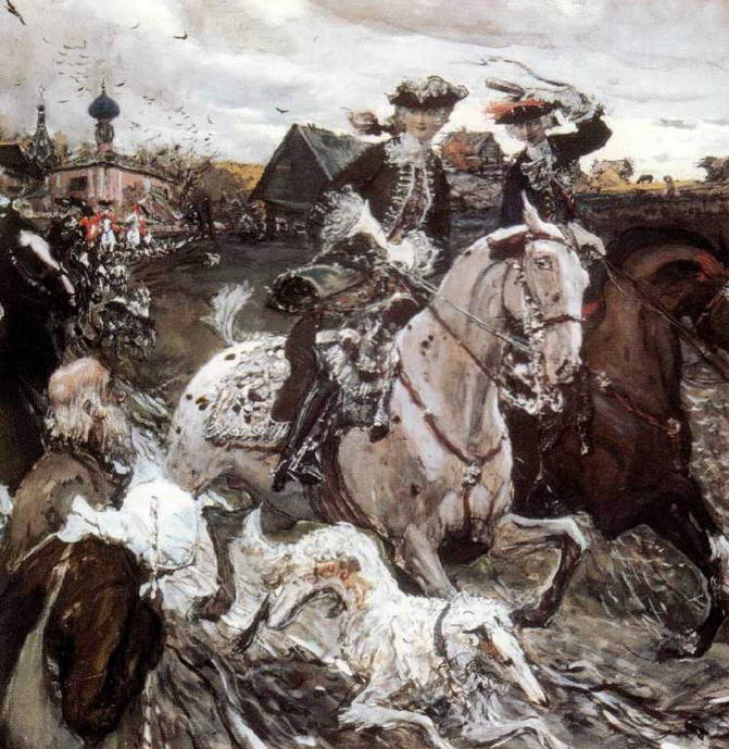 Бенуа, увлеченный русским искусством XVIII века, «первый заговорил о великолепии барокко, о дивных созданиях Растрелли, о красоте Петербурга и сказках Петергофа и Царского Села, - писал Грабарь. - Бенуа... обожал Петра и Елисавету, и заразил этим обожанием такого с виду не падкого на энтузиазм человека, каким многим казался Серов». В 1900-1902 годах Серовым были выполнены иллюстрации к изданию Царская охота, выпускавшемуся по инициативе полковника Николая Ивановича Кутепова, заведующего хозяйственной частью дворцовой службы. Это было роскошное четырехтомное издание, в иллюстрировании которого также принимали участие Бенуа, Виктор и Аполлинарий Васнецовы, Репин, Суриков и другие знаменитые мастера. Сюжеты для иллюстрирования предоставлялось выбирать самим художникам, и Серов, «зараженный» страстью мирискусников к XVIII веку, выбрал эпизоды из времени Петра I, Елизаветы и Екатерины II.