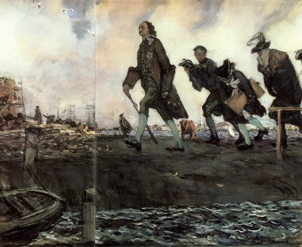Картина написана по заказу издателя и книготорговца Иосифа Николаевича Кнебеля для репродуцирования в серии «школьных картин» по русской истории. «Страшно, судорожно, как автомат, шагает Петр... Он похож на Божество Рока, почти на смерть; ветер гудит ему по вискам и напирает в грудь, на глаза. Еле поспевают за ним испытанные, закаленные “птенцы”, с которых он смыл и последний налет барского сибаритства, которых он превратил в денщиков и рассыльных. Глядя на это произведение, чувствуешь, что... в императора Петра I вселился грозный, страшный бог, спаситель и каратель, гений с такой гигантской внутренней силой, что ему должен был подчиниться весь мир и даже стихии», - писал о картине Александр Бенуа. «Гений - парадоксов друг» - Серов увидел Петра в том парадоксальном «двуединстве», которое у Бенуа выражено словами «спаситель и каратель» и которое с разительной точностью и лаконизмом сформулировано Пушкиным в Полтаве: ...Его глаза Сияют. Лик его ужасен. Движенья быстры. Он прекрасен, Он весь, как божия гроза. Картина Серова представляет не только Петра, но и его столь же «ужасное и прекрасное», как и он сам, творение - Петербург. Петр со свитой шествует по необжитой, суровой земле, где бродят коровы, «по мшистым, топким берегам», к которым подступают, «котлом клокоча и клубясь», тяжелые невские волны. На дальнем же плане - панорама города, ряд построек вдоль берега реки, среди которых возносится сверкающий, словно озаренный солнцем, проглянувшим вдалеке во время грозы, шпиль Петропавловского собора. Эта панорама, эта бледно-сиреневая вода, цвет которой столь резко контрастирует с общим тоном картины, напоминают несколько условную театральную декорацию, на фоне которой разворачивается действие. Известно, что строительство Петропавловского собора с его знаменитым шпилем было завершено лишь почти десятилетие спустя после смерти Петра. Зрелище на дальнем плане - прекрасное видение, словно пророчество о будущем великом городе: Прошло сто лет, и юный град, Полнощных стран краса и диво, Из тьмы лесов, из топи блат Вознесся пышно, горделиво.