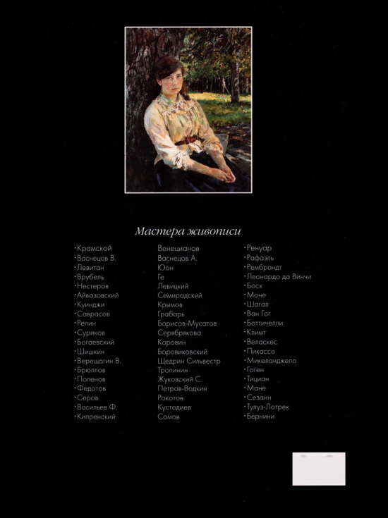 Автопортрет. 1885 - 4 Автопортрет. 1901 -20 Анна Павлова в балете Сильфиды. 1909 - 43 Баба в телеге. 1896 - 35 Волк и Журавль. 1895-1911 -37 Волы.1885 - 34 Выезд Екатерины II на соколиную охоту. 1902 - 39 Девочка с персиками. 1887. Фрагмент - 5 Девочка с персиками. 1887 - 51 Девушка, освещенная солнцем. 1888 - 7 Дети Боткины. 1900 - 29 Дорога в Домотканове зимой. 1904 - 32 Ели. 1890-9 Заросший пруд. Домотканово. 1888 - 52-53 Зима в Абрамцеве. Церковь. 1886 - 10 Зимой. 1898 — 2-3 Ида Рубинштейн. 1910 - 44-45 В.И. Качалов. 1908-19 Квартет. 1895-1911 -37 Кубок большого орла. 1910-40 Купание лошади. 1905 - 37 Летом. Портрет О.Ф. Серовой. 1895 - 12 Мика Морозов. 1901 - 28 И.М. Москвин. 1908 - 19 На Мурмане. Этюд из путешествия на Север. 1894 - 34 Набережная Скьявони в Венеции. 1887 - 8 Одиссей и Навзикая. 1910 - 46-47 Одиссей и Навзикая. 1910-47 Октябрь. Домотканово. 1895 - 32-33 Осень. Домотканово. 1892 - 35 Петр I. 1907-58-59 Петр I в Монплезире. 1910-1911 - 40 Петр I на псовой охоте. 1902 - 38 Петр II и цесаревна Елизавета Петровна на псовой охоте. 1900 - 39 Портрет К.Д. Бальмонта. 1905 - 19 Портрет С.М. Боткиной. 1899 - 27 Портрет Г.Л. Гиршман. 1907 - 24 Портрет В.О. Гиршмана. 1911 - 25 Портрет Максима Горького. 1905 - 17 Портрет С.М. Драгомировой. 1889 - 13 Портрет актрисы М.Н. Ермоловой. 1905 - 16 Портрет И.Е. Забелина. 1892 - 18 Портрет Т.П. Карсавиной. 1909 - 42 Портрет художника К.А. Коровина. 1891 - 55 Портрет И.И. Левитана. 1893 - 15 Портрет писателя Н.С. Лескова. 1894 - 18 Портрет А. Мазини. 1890 - 14 Портрет С.И. Мамонтова. 1879 - 9 Портрет П.А. Мамонтовой. 1889 - 12 Портрет З.В. Мориц. 1892 - 18 Портрет И.А. Морозова. 1910-30 Портрет К.А. Обнинской с зайчиком. 1904 - 29 Портрет Е.П. Олив. 1909 - 26 Портрет М.К. Олив. 1895 - 25 Портрет графини С.В. Олсуфьевой. 1911 - 26 Портрет княгини О.К. Орловой. Рисунок. 1911 - 62 Портрет княгини О.К. Орловой. 1911 - 63 Портрет великого князя Павла Александровича. 1897 - 21 Портрет А.П. Павловой. 1909 - 42 Портрет Н.С. Позднякова. 1908 - 19 Портрет художника И.Е. Репина. 1901 - 15 Портрет В.С. Серовой. 1880 - 6 Портрет графа Ф.Ф. Сумарокова-Эльстона, впоследствии князя Юсупова. 1903 - 22 Портрет Ф. Таманьо. 1891 - 14 Портрет О.Ф. Трубниковой. 1885 - 6 Портрет Ф.И. Шаляпина. 1905 - 17 Портрет княгини П.И. Щербатовой. 1911 - 31 Портрет князя Ф.Ф. Юсупова, графа Сумарокова-Эльстона. 1903 - 23 Портрет княгини З.Н. Юсуповой. 1900-1902 - 56 Портрет княгини З.Н. Юсуповой. 1902 - 57 Похищение Европы. 1910 - 60-61 Принц (Всадник на коне, с соколом в руках). 1910-45 Прудик. Абрамцево. 1886 - 10 «Солдатушки, бравы ребятушки, где же ваша слава?». 1905 - 41 Стригуны на водопое. Домотканово. 1904 - 36 У перевоза. 1905 - 11 Финляндский дворик. 1902 — 36 Флоренция. Улица Торнабуони. 1904 — 8 Художник К.А. Коровин на берегу реки. 1905 - 54 Черт, вылезающий из корчаги. Ваза. 1890-е - 8 Эскиз-вариант занавеса для балета Шехеразада. 1910-45 Яблоки на листьях. 1979 - 50 М.А. Врубель. Девочка на фоне персидского ковра. 1886. Фрагмент - 5
