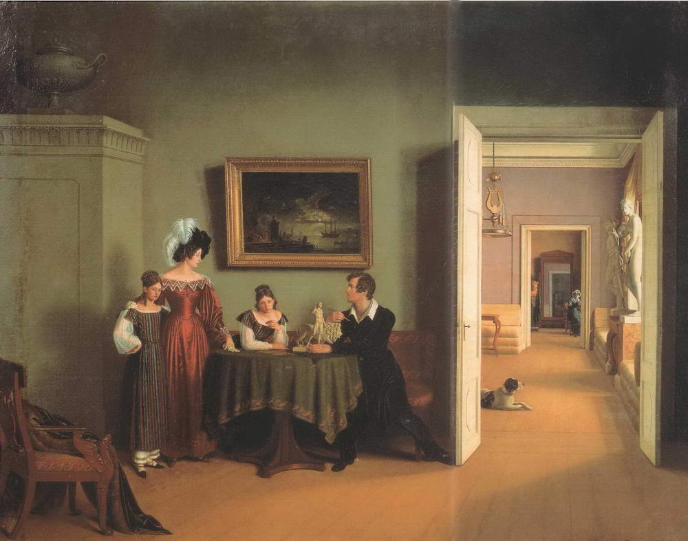 Когда картина была закончена, художники отметили, что, действительно, с равной мерой отчетливости были написаны и комнаты и предметы в них, но заметили также, что комнаты пустоваты. Толстой велел пришить к картине с левой стороны холст такой величины, чтобы можно было написать первую комнату во всю ее длину. Около стола, под картиной Клода Верне, Толстой написал себя и свою семью: супругу Анну Федоровну и дочерей - Елизавету и Марию. Скульптор предстал в портрете воплощением воли и энергии. Зримое воплощение его творческой деятельности - скульптурная композиция, задуманная Толстым как символ победы силы духа человека над физической силой зверя. Толстой писал портрет долго, с тщательностью миниатюриста. Любовно и внимательно всматриваясь в облик жены и дочерей, он, уловив их характерные особенности, представил в них вечные женские образы. Граф и графиня в портрете - диалог и единение мужской силы и очарования женственности, независимой активности и мягкой стойкости, твердости и изысканности. Старшая дочь Елизавета, с томной грацией рассматривая что-то миниатюрное - камею или медаль, задумалась. Младшая Мария, упершись ручкой в бок, смотрит прямо на зрителя.