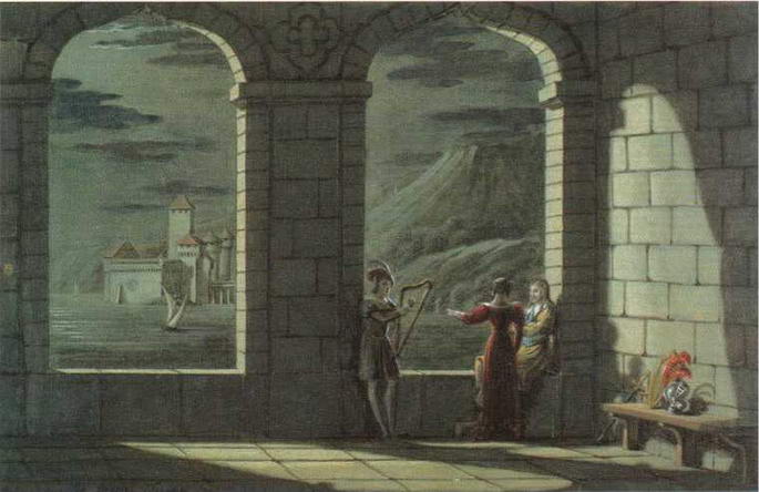 В рисунке гуашью У окна в лунную ночь (1822) призрачный лунный свет преображает интерьер, заставляя неодушевленные предметы казаться оживающими. Девушка в белом платье у венецианского окна - Александра, младшая сестра первой жены художника. А за окном таинственной и уютной комнаты - завораживающая бесконечность неба и застывший торжественный город. Художник сделал зримым ощущение томления романтической души, поверяющей свои тайные мечты звукам и волшебной красоте ночи. Толстого - и в этом тоже его близость романтизму - всегда увлекало новое. Стремление романтиков уловить прекрасное не только в античности, но в разных временах, культурах и у разных народов близко Толстому, чуткому ко всему, что появлялось в литературно-художественной жизни, к новым веяниям и вкусам, "...изучая по силам моим все, что просвещенному художнику знать необходимо, я восхищаюсь в душе произведениями истинно великих дарований, я, однако ж, пошел и иду, ни мало не придерживаясь и не подражая ни одному из них своею собственной дорогой..."[1 Э.В. Кузнецова, указ, соч., с. 76.] - признавался он. Сцены из рыцарских времен могли бы стать иллюстрациями рыцарских романов. Толстой, действительно, был чуток к особенностям разных эпох, но, обращаясь к ним, каждый раз воссоздавал по-своему и мир Греции, и готики, и Ренессанса. В работах зрелых лет мастера появляются новые образы. Время всесильно, порой изменяют немногие годы Имя и облик вещей, их естество и судьбу[2 Античная лирика. M., 1968, с. 198.], - заметил философ и поэт Платон. В рисунках Толстого Сатурн косит древний мир (1843), Сатурн, скосив пышные дела древних народов, сложил их в стог и продолжает косить наш век (1844) появился символ неумолимого течения времени. Но юность и красота не исчезают и в поздних рисунках Толстого. "Под игру Амура Юность предается забавам, а Время засыпает" - неспешный ритм куп деревьев, пологие холмы, пруды с целующимися лебедями, вечное цветение и тишина. Прекрасны танцующие юноша и девушки. Стройные, с изящными движениями рук, с гирляндой цветов, с развевающимся легким шарфом, чуть касающиеся земли, они кажутся парящими. Складки легчайших одежд, естественно повинующиеся движениям фигур, превращены художником в чарующую игру линий. Толстой выбрал для рисунка золотисто-коричневого цвета бумагу, чуть рыхлая поверхность которой создает впечатление мягко сияющей бархатистости. Рисунок на этой бумаге обретает драгоценность тисненого бархата. Перевернем еще одну страницу воображаемого альбома. Всматриваешься в Архитектурный пейзаж под прозрачной бумагой (1837), удивляешься - как просто! - но не можешь оторвать восхищенных глаз.