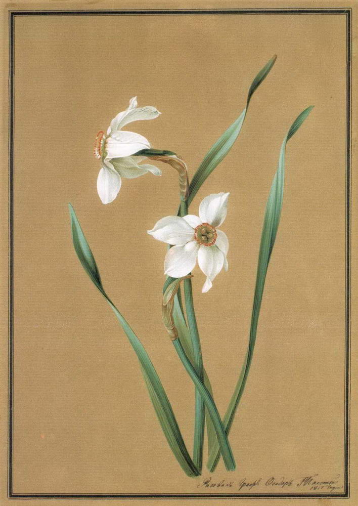 Толстой вспоминал, что попробовать рисовать цветы ему предложила императрица Елизавета Алексеевна. Императрица получила в подарок альбом с изображением цветов работы знаменитого парижского художника и пожелала узнать мнение Толстого о его работе. Отметив мастерство и "французский шик" работы живописца, Толстой заметил, что "желание блеснуть эффектом" сделало цветы одинаковыми. Тогда же Толстой сформулировал свое представление о работе с натуры: "Со строгой отчетливостью переводить с натуры на бумагу копируемый цветок, как он есть со всеми малейшими подробностями, принадлежащими этому растению"[1 Записки графа Ф.П. Толстого, с. 207.].