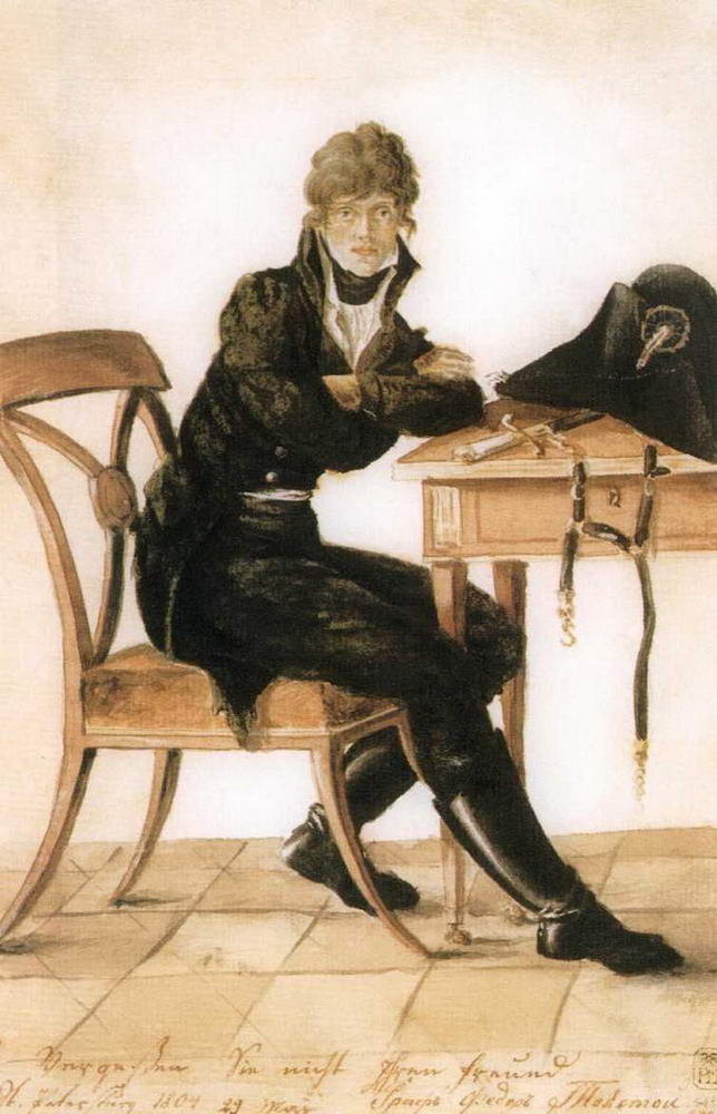 Самый ранний автопортрет Толстого датирован 29 мая 1804 года. Морской офицер представил себя светским, изящным молодым человеком в штатском - он уже окончил полный курс в Академии художеств, он - великолепный наездник, прекрасный танцор, которому знаменитый Шарль Дидло прочил блестящую артистическую карьеру; страстный охотник биться на рапирах, которые требуют не только проворства, но большей тонкости и умения угадывать в глазах и выражении лица намерения противника. Круг его интересов обширен. «Я чувствовал, что мне много не доставало, - вспоминал Толстой. - Корпусное учение могло только доставлять просто порядочного флотского офицера, а не образованного человека, а мне хотелось быть образованным, и поэтому я употребил все средства, чтобы ознакомиться с людьми, отличающимися по наукам, и посещать публичные лекции»[1 Э.В. Кузнецова. Ф.П. Толстой. М., 1 977, с. 15.]. Толстой изучал политэкономию, историю, физику, химию, зоологию, археологию. Он не только с восторгом читал, но и изучал литературу, стал членом всех литературных обществ. Он познакомился с Иваном Крыловым, Василием Жуковским, Николаем Гнедичем, Николаем Карамзиным. По воскресным вечерам у молодого офицера собирались приятели, умные образованные, стремившиеся, как и он, быть полезными любимому отечеству. Автопортрет кажется свидетельством поворотного момента в судьбе - вскоре после его создания Толстой подал в отставку. Он мечтал служить в кавалергардском полку, но император Александр I, познакомившись с работами Толстого, предложил юноше избрать деятельность скульптора, заметив, что кавалергардов много, а талантов мало. «Это предложение более всего согласовалось с моею привязанностью к художествам и с твердыми принятыми мною правилами быть по службе обязану только самому себе полученными наградами и повышениями, а отнюдь не с помощью протекции и покровительства, для чего я был слишком горд»[2 Записки графа Ф.П. Толстого, с. 142.], - писал Толстой. Для дворянина даже статская служба, за исключением дипломатической, считалась занятием неблагородным. Решение графа Толстого посвятить себя искусству ошеломило светское общество, вызвало настоящий скандал.