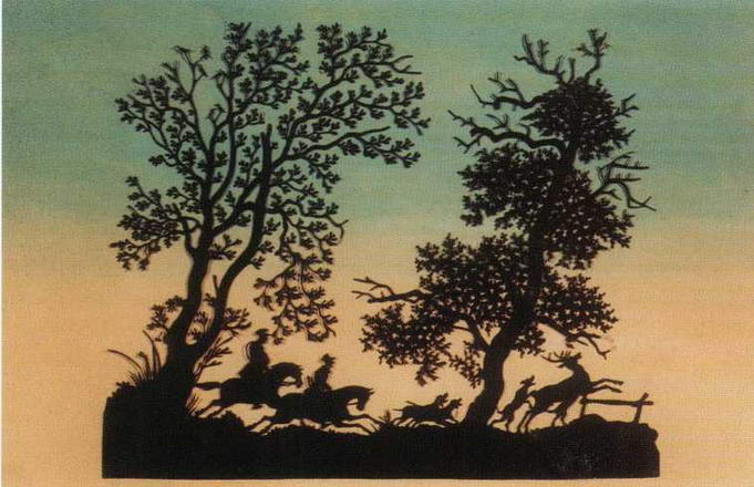Кроме воспоминаний о былом у Толстого было еще несколько любимых тем. Много раз он вырезал из бумаги сценки военных маневров, бивуаков, смотров, парадов кадетских корпусов, которые он видел летом в Петергофе. Наблюдательность Толстого запечатлела в сценах охоты и поведение охотников и повадки зверей. Стремителен бег проносящегося оленя и преследующих его собак и всадников. Мастерски переданы движения лошади, перепрыгивающей через речку или взбирающейся по склону, медведя, поднявшегося на задние лапы и обороняющегося от нападающих на него, оглушительно лающих собак, уходящей по перекинутому дереву лисы. Изображая охоту на уток, художник выбирает точку зрения чуть сверху - видна спокойная гладь озер, выступающие из воды отдельные деревца или островки с пышными кронами деревьев. Охотники стреляют, и вспугнутые утки взлетают веером. Блеск воды художник создает прорезями, а листву - накалыванием, это придает купам деревьев декоративную изысканность. Силуэты сохранили то, что привлекло внимание Толстого на улицах провинциальных русских городов. Выразительные позы, характерные жесты жителей, предметы их одежды - мундир, шинель, платок, фуражка - и перед нами будочник с алебардой в руке указывает дорогу всаднику, фонарщик в накинутой шинели отгоняет преследующую его собаку, две кумушки беседуют, взмах плетки ямщика и переступающая не спеша, а, может быть, осторожно по скользкой дороге лошадь.