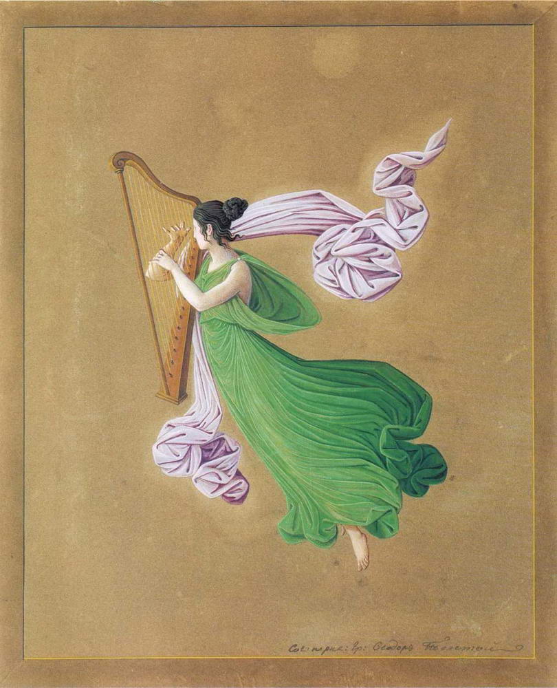 Слава тонкого изящного рисовальщика сопровождала Толстого в течение всей его долгой жизни. В начале XIX века рисунок перестал восприниматься лишь как подготовительная стадия работы; более того, он стал самостоятельной областью искусства. Толстой одним из первых мастеров начала XIX века увлекся камерной формой искусства - рисунком. "...О, как завидна участь поэта! - восклицал Толстой. - Счастливец, он может свои чувства, радости сердца, восторги души, забавы игривой беспредельной фантазии передавать другим в приятных гармонических для слуха напевах, в восхитительных для ума формах!"[1 Э.В. Кузнецова, указ, соч., с. 199.] Кисть, перо, карандаш стали для Толстого выражением его чувств, фантазий, восторгов. В музеях и частных коллекциях хранится более тысячи его рисунков. Перелистаем альбом рисунков мастера, воображаемый альбом объемом в целую жизнь художника. Здесь много контурных очерковых рисунков, в которых Толстой не знал себе равных. Блестяще владея линией, он отлично знал выразительные возможности и других графических техник и тонкости производимого ими впечатления. Выбор той или иной техники и художественных приемов диктовался замыслом и изящным вкусом Толстого. Нежными акварельными переливами созданы Пасторали: безмятежная любовь пастухов и пастушек, замечтавшийся юноша с лирой в руках, мелкий прихотливый рисунок листвы деревьев, пасущиеся овечки и коровы, речка - конечно, тихая, ручейки - конечно, журчащие, пленительный сладостный мир идиллии.
