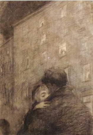 Через весь творческий путь художника прошло это поэтическое восприятие человека, чувствующего себя таким одиноким, а порой и никому ненужным, в большом городе XX века. Илья Глазунов, изображая сокровенные грани интимных переживаний, дает нам радость их познания, которая разрушает наше одиночество. Он наполняет музыкой своей души серые будни. Как одинока фигура дворника, увиденного из окна на синем ночном снегу... Не ясно, то ли это мужская, то ли женская фигура, закутанная от мороза, остановилась на мгновение, увидев на холодном снегу отсвет чьей-то радости - блик огней от новогодней елки. А над городом уже встает новый рассвет. Кажется, что так будет всегда... Сегодня лишь в элитных домах есть лифтерши, а раньше это было обычным явлением.