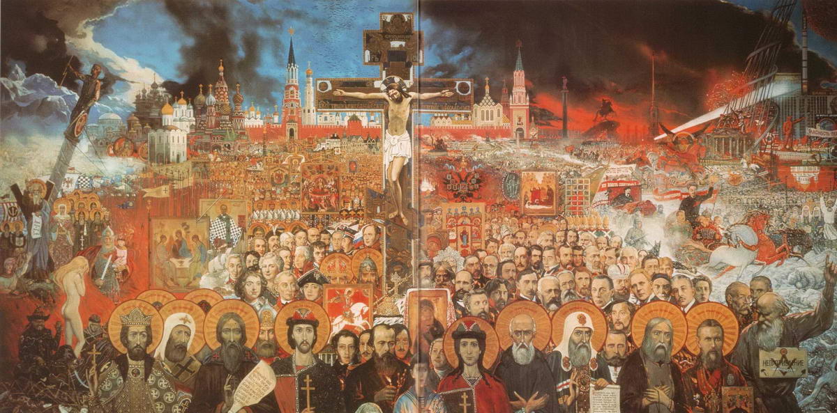 Картина Мистерия XX века, как бомба, взорвала нашу общественность. «Картина, которую никогда не увидят русские», - писал итальянский журнал Oggu в 1977 году. И мы действительно увидели ее только в 1991 году в Доме молодежи на Комсомольском проспекте в Москве. Судьба Глазунова висела на волоске. Власти решили выслать его из СССР, как и Солженицына. Говорят, при обсуждении судьбы художника решающим оказался голос главного советского идеолога М.А. Суслова, который сказал: «Не плодите диссидентов». Глазунова было решено отправить в тайгу на БАМ, где он провел два месяца, написав немало работ, отражающих суровую жизнь строителей и яркие образы простых рабочих людей. И снова - борьба. И снова - новые работы. И снова - новые выставки, которые так ждал и ждет наш изголодавшийся по правде и истинному искусству народ. Художник, как и все мы, явился свидетелем продолжения апокалипсической мистерии постсоветского времени. Отошла в небытие нашумевшая перестройка. В Беловежской пуще три бывших коммуниста, ставшие демократами, подписали столь пагубное для нашей великой державы соглашение: «Каждый взял себе суверенитета столько, сколько мог унести». Американский флаг стал победоносно развеваться над миром как флаг единственной сверхдержавы. Как всегда неистовый в работе и неустрашимый в определении добра и зла, творящегося в мире, Илья Глазунов решил продолжить Мистерию XX века, оборванную на временах Брежнева. Он нашел, ничего не меняя, новое композиционное решение. В первой Мистерии, которую он написал в 1977 году, художник изобразил себя, сорокалетнего, словно отодвигающим театральный занавес, чтобы показать нам - зрителям - кошмар XX века.