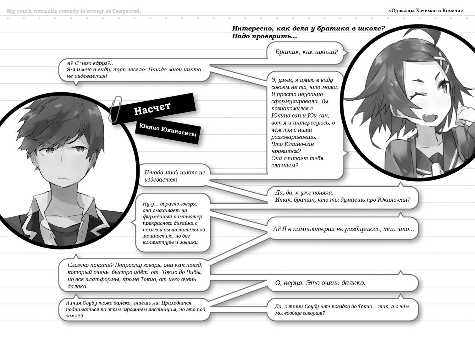 В клубной комнате на четвёртом этаже на своём обычном месте, в самом сердце клуба помощников, сидела Юкино Юкиносита с обычным, неизменно холодным выражением лица.Что было необычным, так это журнал мод в её руках вместо привычного романа. Очень нехарактерно для неё.А если вас интересует, что поменялось ещё, она перешла на летнюю форму одежды. Вместо блейзера на ней был предписанный школьными правилами жилет. «Предписанный школьными правилами» — синоним слова «убогий», но Юкиносита в нём выглядела на удивление хорошо, словно источая ауру изысканности.— Привет, — сказал я.Юкиносита коротко вздохнула. — А, это ты, Хикигая. — И снова уставилась в журнал.— Не могла бы ты перестать реагировать как девчонка, рядом с которой меня посадили? Задевает, знаешь ли.Смена мест в классе — весьма травмирующее событие. Она разрушает привычный образ жизни. Это не катастрофа, конечно, но очень неприятно, потому как проявляет истинную натуру людей.И ежемесячная смена мест — прекрасный тому пример.— Нет, правда, что они относятся ко мне как к вонючему бомжу, хотя я не сделал ещё ничего плохого? Тянут жребий, и кому выпадает сидеть рядом со мной, горько плачут о своей участи.— Так ты признаёшь, что сидеть рядом с тобой крайне неприятно…— Ничего такого я не говорил. Это ты сама себе придумала.— Прошу прощения. К сожалению, я сказала, не подумав. — Юкиносита слегка хихикнула. (Хотя это тоже больно…) — Опять не подумала, так что не бери в голову. Я думала, ты говоришь о Юигахаме.— А, вот значит как?У Юкиноситы были на то определённые основания. Юигахама уже пять дней в клубе не показывалась. Наверно, Юкиносита надеялась, что она сегодня всё-таки придёт.— Позавчера был срочный осмотр у ветеринара, вчера какие-то домашние дела… — Тихо пробормотала Юкиносита, глядя на экран своего мобильника. Наверно, читала письма Юигахамы — письма, которых я никогда не получал.Разумеется, я и сам задавался вопросом, придёт ли сегодня Юигахама в клуб. И если бы она пришла, она, конечно же, чувствовала бы себя со мной так же неловко, как сегодня утром.Я слишком хорошо знаю, чем такое кончается. Мы постепенно отдаляемся друг от друга, не общаемся и в конце концов совсем перестаём видеться. Источник: я.Мои одноклассники из начальной школы, из средней школы — со всеми ними было именно так. И так же, наверно, будет и с Юигахамой.В клубе стояла тишина.Её нарушал лишь лёгкий шелест, с которым Юкиносита переворачивала страницы своего журнала.