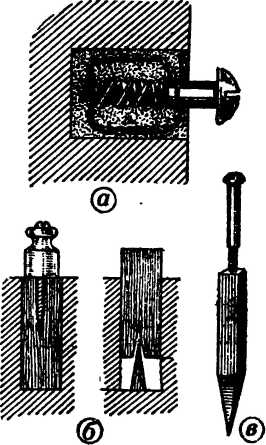 Рис. 15. Различные способы крепления роликов на кирпичной стене: а — при помощи проволочной спирали; б — при помощи деревянных пробок; в — при помощи дюбеля.