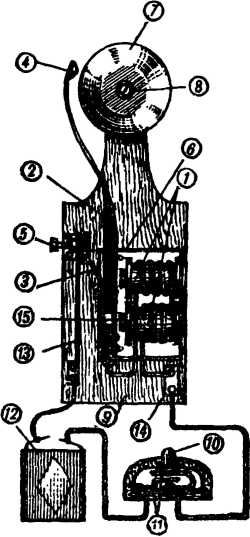 Для этого аппарата можно взять готовыми основные части, например микротелефонную трубку (ее легко собрать из готовых микрофона и телефона), детский звонок от электроконструктора, телефонный трансформатор. Однако вызывную кнопку и рычажный переключатель необходимо изготовить самим. Вызывная кнопка состоит из четырех контактных пластинок, изготовленных из упругой листовой латуни или бронзы по форме и размерам, показанным на рисунке 83, з. Основанием для кнопки служит монтажная панель аппарата, а крепление пластинок к панели показано на рисунке 83, и. Головка вызывной кнопки изготавливается из сухого дерева по размерам, показанным на рисунке 83, к. Переключатель предназначен для переключения схемы аппарата с приема вызова на передачу речи. Он представляет собой простейшую вызывную кнопку, у которой иначе соприкасаются контактные пластинки (рис. 83, л). Кроме того, корпус кнопки значительно удлинен и на него насажена небольшая, трубочка, внутри которой закреплен рогообразный рычаг. Если микротелефонная трубка лежит на рычаге, то под действием ее тяжести рычаг перемещается вниз до упорной шпильки. При этом рычаг своим основанием давит на пластинки 2 и 4, отводя пластинку 2 от пластинки 1, а от пластинки 3 — пластинку 4, которая, в свою очередь, соприкоснется с пластинкой 5. Такому положению переключателя соответствует прием и подача вызова. Стоит снять микротелефонную трубку с рычага, как контактные пластинки под действием своей упругости возвратятся в первоначальное положение, при котором снова плотно соприкоснутся пластинка с пластинкой 1, пластинка 4 с пластинкой 3. Такому положению цепи соответствует передача и прием речи. Чтобы подать вызов, надо положить трубку на рычаг и нажать на вызывную кнопку. Конструкция подобного рычажного переключателя весьма проста. Детали рычага изображены на рисунке 83, м. Рычаг в собранном виде показан на рисунке 83, н. Основание рычага надо выточить из сухого дерева в виде кнопочки с продолговатым корпусом. На корпус насаживают небольшой отрезок металлической трубки соответствующих размеров. Из мягкой проволоки диаметром 3–4 миллиметра выгибают рычаг 10 (рис. 83, м), который туго вставляют в верхнюю часть трубки 11. Затем трубку насаживают на деревянное основание 12 и, отступив на 5–6 миллиметров от верхнего края основания, просверливают небольшое сквозное отверстие под металлическую шпильку-упор, ограничивающий перемещение рычага вниз. Контактные пластинки рычага имеют те же размеры и форму, что и пластинки простейших вызывных кнопок. Сборка рычага производится следующим образом. Сначала на монтажной панели на определенном месте просверливают отверстие диаметром 10–12 миллиметров. С внутренней стороны панели отверстие рассверливают на глубину 3–4 миллиметра сверлом или перкой диаметром 15–16 миллиметров, чтобы основание рычага уходило заподлицо. Затем к панели прикрепляют контактные пластинки согласно монтажной схеме аппарата. На основании рычага укрепляют корпус и пропускают шпильку через отверстие в корпусе. На некотором расстоянии от рычага сверху на монтажной панели укрепляют подставку 13 трубки, изогнутую из проволоки.Сборка аппарата