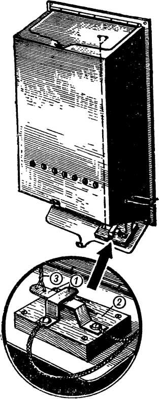 Ввод проводов в квартиру производят в большинстве случаев от переходной коробки, помещаемой обязательно вне квартиры. Очень часто к зданию подводятся три провода. Каждый провод называют фазой. Переходные коробки обычно устанавливаются для перехода с трех проводов на два, реже — с трех на три. Кроме того, на переходных коробках устанавливаются плавкие предохранители на случай короткого замыкания в сети. Короткое замыкание происходит при соединении оголенных проводников и при неисправностях в сети. Рассмотрим устройство переходной коробки с трех фаз на две (рис. 9).