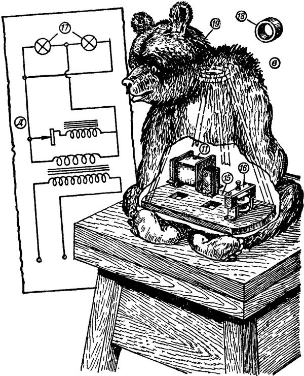 Он состоит из деревянного основания 1, стойки ключа 2, сделанной из медной пластинки толщиной 1,5–2 миллиметра, и деревянного коромысла 3, обтянутого с трех сторон жестяным кожухом 4. На одном конце коромысла ставят головку ключа 5, прикрепленную винтом 6 и гайкой 7. На противоположном конце коромысла крепят передний контактный винт 8, закрепленный гайками 9. В отверстие, расположенное на коромысле ближе к стойке, пропускают регулировочный винт 10 ключа с гайкой 11. На винт надевают пружину 12, одним концом ее прикрепляют к основанию ключа скобочкой 13. Пружину ключа (6–8 витков) изготовляют из стальной проволоки диаметром 0,3–0,5 миллиметра. Стойку 2 крепят в середине основания ключа, а по обеим сторонам от нее, против переднего и заднего контактных винтов, ввинчивают в качестве переднего и заднего контактных упоров шурупы 14 и 15. Снизу к ним припаивают гибкие изолированные провода, для которых в основании ключа делают специальные бороздки. К стойке тоже припаивают гибкий провод, который снизу основания прокладывают в бороздке и закрепляют железными скобочками. Регулировка собранного ключа заключается в установлении нужного зазора между нижними концами контактных винтов 8 и 6 и контактными упорами 14 и 15. Этот зазор должен быть от 3 до 5 миллиметров. Упругость хода ключа регулируют натяжением пружины 12 с помощью винта 10 и гайки 11. После изготовления всех частей аппарата приступают к его сборке. На вертикальной стенке б (рис. 84, а) сначала укрепляют валики 7, 8 и 9. Затем к концам коромысла 12 прикрепляют якорь 13 и пишущее колесико 14. После этого надо приложить коромысло к вертикальной стенке и разметить места для крепления электромагнита и чернильницы. Чернильницу 10 крепят к вертикальной стенке хомутиком 11. Для перемещения чернильницы вверх и вниз в хомутике делают вырезы под стягивающие шурупы. На деревянном основании укрепляют электромагнит 2. Затем закрепляют на оси коромысло 12 и подвешивают его с помощью пружины 17 к кронштейну 15. Расстояние между якорем и наконечником электромагнита подбирают путем подтягивания винта 18 пружины 17. Ориентировочно зазор между якорем и электромагнитом должен быть 3–4 миллиметра. На основании аппарата со стороны электромагнита прикрепляют телеграфный ключ 3. Провода от обмотки электромагнита и от ключа пропускают в бороздки под основание аппарата и закрепляют их скобочками. Между электромагнитом и ключом прикрепляют зажимы Л1 и Л1 для присоединения линии. Схема соединения двух аппаратов была приведена на рисунке 84, б. После монтажа схемы прикрепляют стойку с бобинами так, чтобы телеграфная лента ложилась на валики без перекосов. В противном случае лента при движении будет спадать. Бобины должны свободно вращаться на своих осях. На этом сборка аппарата заканчивается.