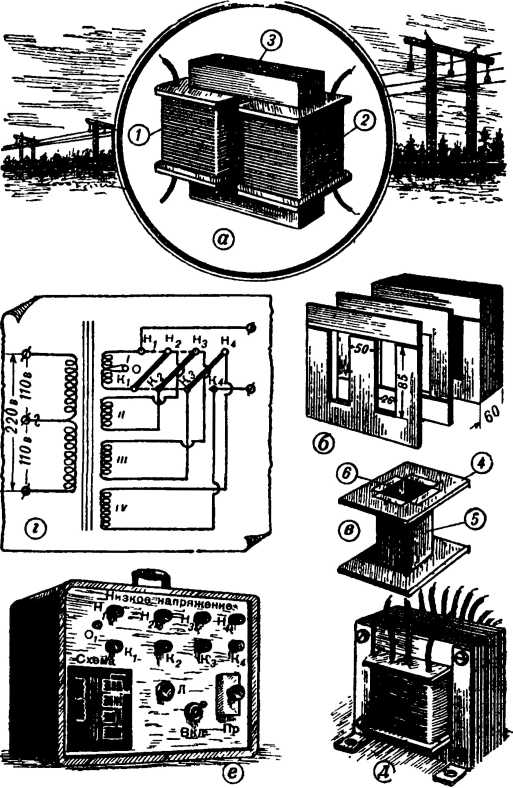 Рис. 72. Самодельный понижающий трансформатор и его части.