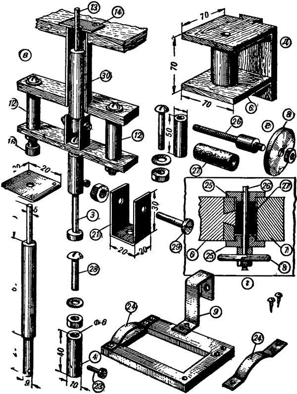 Для успешного изготовления приборов и моделей, имеющих хороший внешний вид, необходимы различные приспособления, позволяющие быстро и точно выполнить те или иные виды работ. С этой целью можно приспособить один и тот же инструмент для нескольких операций по изготовлению деталей. Рассмотрим наиболее простые и оригинальные приспособления. Универсальное приспособление для вырубки отверстий. В работах юного пионера-электротехника часто встречаются случаи, когда приходится точно вырубать круглые отверстия в листовом металле или дереве диаметром от 25 до 100 миллиметров. Для этой цели можно изготовить приспособление, показанное на рисунке 88, а.