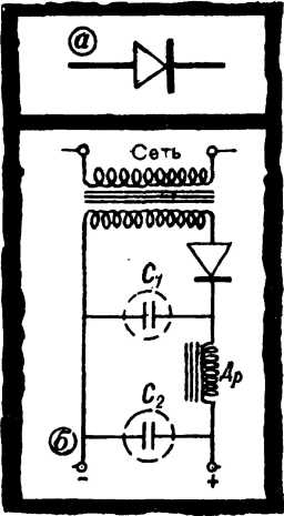 Рис. 78. Условное обозначение выпрямителя (а) и схема однопериодного выпрямителя с фильтром (б): С1 и С2 — электролитические конденсаторы; Др — дросселе низкой частоты.