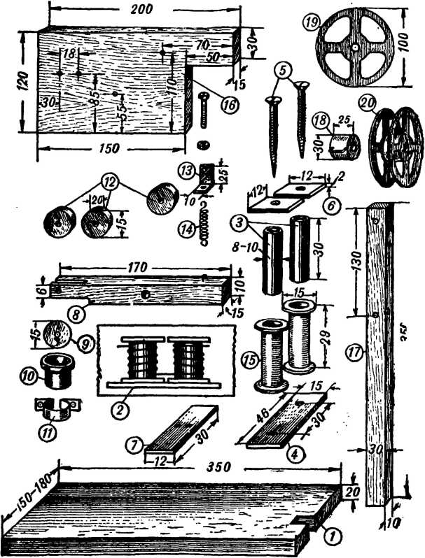 Все части телеграфного аппарата монтируют на деревянном основании 1 размером 350х160х20 миллиметров. Форма и размеры деталей телеграфного аппарата показаны на рисунке 85. В таком аппарате телеграфная лента протягивается телеграфистом. Электромагнит 2 аппарата состоит из двух катушек, намотанных в противоположные стороны проводом ПЭ-02. На каждую из катушек уложено по 600 витков. На всю обмотку электромагнита берут 60–70 метров провода. Сердечники 3 катушек электромагнита изготовляют из мягкой железной трубки. Их размеры приведены на рисунке. Сердечники прикрепляют к железной пластинке 4 с помощью шурупов 5. Под головки шурупов подкладывают квадратики 6 из мягкого железа. Они служат полюсными надставками, которые уменьшают рассеивание магнитных линий, идущих из одного полюса электромагнита в другой. Якорь 7 электромагнита делают тоже из мягкого листового железа. Каркасы катушек 15 электромагнита склеивают из плотного картона по размерам сердечника. На одном каркасе обмотку наматывают в одну сторону, а на другом — в противоположную Затем конец обмотки одной катушки соединяют с началом другой, как показано на рисунке.
