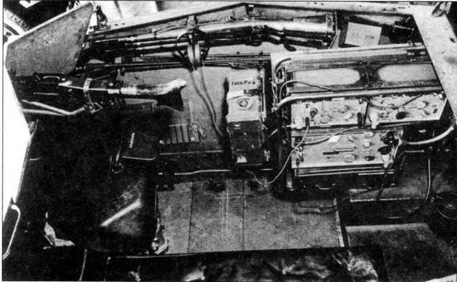 Боевое отделение машины связи Sd.Kfz.250/3 с радиостанцией Fu 8. Пулемет MG 34— на своем штатном месте за щитом. На стенке боевого отделения в положении по-походному уложены два карабина 98К