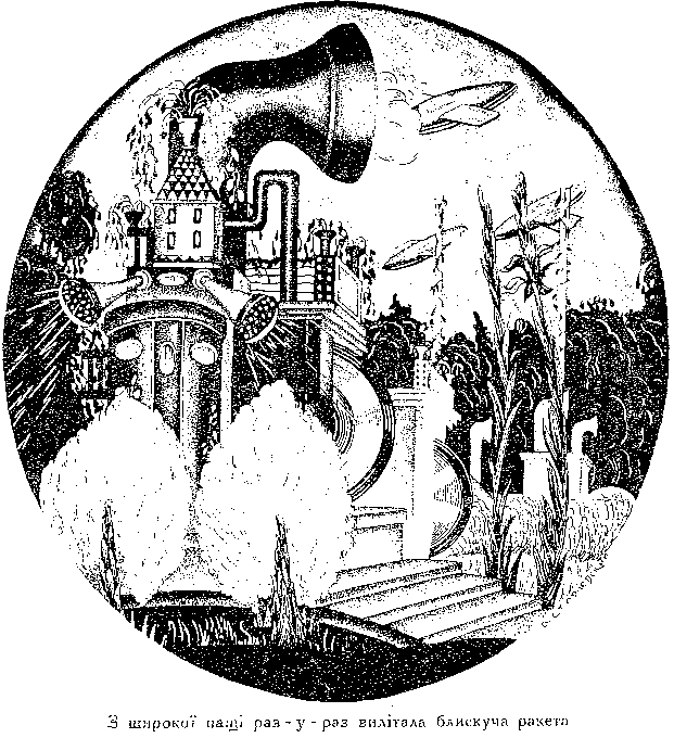 Ченк зупинився перед високою і стрункою машиною, що вгорі мала довгу, наче хобот, руру, яка закінчувалася широкою пащею. З цієї пащі раз-у-раз вилітала блискуча, новенька ракета, робила пробне коло над плацом і з наказу радіоапарату злітала на землю в свій ангар.