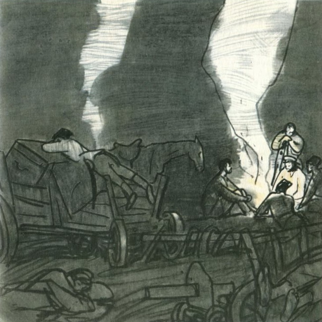 Свисли черными туманами сумерки. Истомленные походом и тревогами отгремевшего дня — спали командиры. Заснул и Федор. Чапаев скоро разбудил его — подписать приказ. Проснулся, подписал, опять уснул. И опять разбудил его Чапаев. Всю ночь, до утра, без сна просидел этот удивительный человек. Проснется Федор и видит, как сидит Чапаев один, только светит скупая лиловая лампешка. Сидит он, склонившись грузно над картой, и тот же любимый циркуль с ним, что был в Александровом-Гаю: померит-померит — запишет, опять смерит и снова запишет. Всю ночь, до петушиного рассвета, мерил он карту и слушал молодецкий храп командиров. У дверей, сжав винтовку в обе руки, дремал часовой и серым лбом долбил по черному ребру штыка.