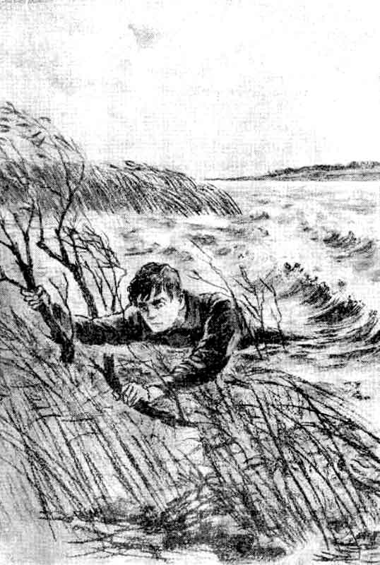 Благинин с трудом втащил тяжёлое, точно налившееся свинцом, тело на маленький островок, занятый тальниковым кустом Корни тальника собрали вокруг себя иловые отложения, наносную почву и скрепили все это своими щупальцами — получилась твёрдая пробка, которая, даже под тяжестью человека, не давала островку глубоко уходить в воду. Тело Ивана находилось только до половины в воде Держась за куст и опомнившись от только что пережитого, он думал: «А что теперь, кто же меня снимет с этого островка?.. Охотники не поедут на промысел, пока буря не утихнет. А сколько она ещё будет буйствовать?» — и чем больше думал Благинин, тем прочнее у него утверждалась мысль, что спасения ждать неоткуда. Пробиваться по лабзе к твёрдому берегу так же было бы безумием. И всё-таки какая-то маленькая искорка надежды заставляла его крепко держаться окоченевшими пальцами за ветвь тальника, чтобы не быть снесённым волной.