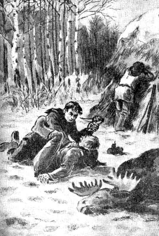 Салимка смотрел, как сцепились в мёртвой схватке два охотника, и растерянно топтался на месте, не зная, что предпринять. И вдруг он затрясся от ужаса, в голове мелькнула мысль: «Всё! Погиб Иван!» Илья, оказавшийся опять под Благининым, дотянулся до охотничьего ножа, валявшегося у распластавшейся туши лося, взмахнул им в воздухе — лезвие ослепительно блеснуло на солнце. Зайнутдинов в испуге закрыл лицо руками, шатаясь подошёл к стогу и обессиленно к нему привалился. «Что ж это я… почему не помешал? Эх, Салимка!» — тоскливо думал он, боясь открыть глаза и увидеть окровавленное тело Ивана, неподвижно лежащее тут же, рядом с загубленным лосем. Какая жуткая тишина! Будто в доме, где лежит покойник. Не скрипит снег, не гудит ветер, путаясь в берёзовом колке на склоне гривы. И вот он наедине с человеком, который в припадке бешенства поднял руку на Благинина. Страшно! — А ты… ты чего смотришь, сволочь! Вместе ведь… — донёсся до Салима хриплый голос Андронникова. Зайнутдинов вздрогнул и открыл глаза. Недалеко от него стоял Благинин и вертел в руках нож Ильи. — Жив! — крикнул обрадованно Салим и хотел было кинуться к Благинину, но в это время Андронников схватил ружьё, стоящее у стога, взвёл курки и рывком выбросил его к плечу, направляя стволы в грудь Ивана. — Врёшь, гад, всё равно не уйдёшь от меня! Благинин побледнел. «Убьёт!» — мелькнула в голове мысль, но в этот миг Салимка, до сих пор ко всему безучастный, кинулся к Андронникову и повис на ружье, бормоча: — Нельзя, мой дружка, нельзя… На гребне гривы показался Филька Гахов, плавно скользя на лыжах по проделанной Благининым лыжне. Андронников опустил ружьё. — Твоё счастье, — невнятно проговорил Илья, потупя взгляд. Благинин и Андронников разошлись в разные стороны, в душе ненавидя друг друга. Салимка, бросив вдогонку Илье короткое: «Шайтан!» — пошёл один по направлению охотничьей избушки, без лыж, утопая по колена в глубоком снегу.