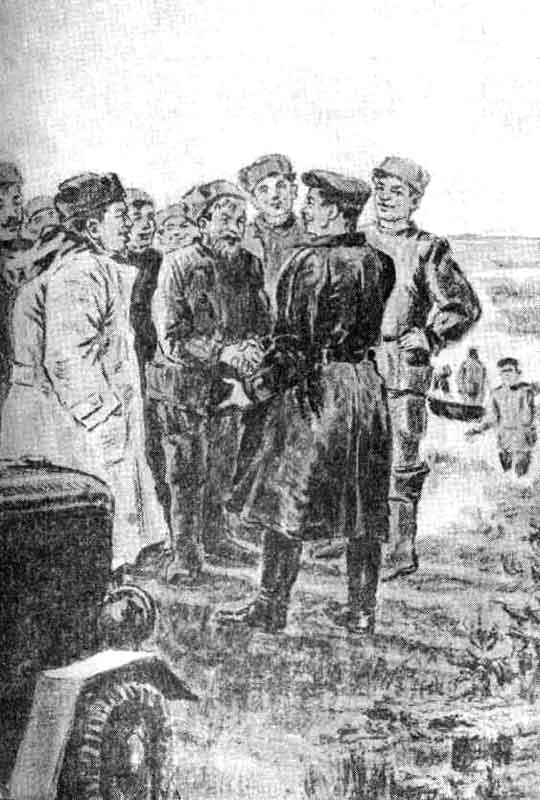 Конец марта. Промысловый сезон окончен. Капканы убраны, последняя добыча доставлена в избушку. Гуляй смелее, зверь. — тебя не подкарауливает больше на протоптанной тропе охотничья ловушка. До встречи осенью! Охотники завершают свои последние дела: снимают шкурки с добытых ещё вчера ондатр, очищают и смазывают солидолом капканы. На лицах возбуждение, слышатся оживлённые разговоры, шутки, смех. Кажется, впервые за всю осень и зиму сегодня никто не торопится. Из районного центра возвратились Прокопьев и Жаворонков. Охотники окружили их. Жаворонков на все вопросы отвечал не торопясь, обстоятельно. И лишь на два вопроса не захотел ответить парторг (что с ним никогда не было раньше!): «Кто занял первенство, мы или николаевцы?» и «Что за ящик привёз он в полотняном чехле?» Второй вопрос, конечно, наивный, который и задал-то в силу своего юношеского любопытства Филька Гахов, потому ответа на него никто и не ожидал, а вот вопрос о первенстве? Об этом каждый хочет знать, но Жаворонков как-то многозначительно посмотрел на всех и… перевёл разговор совсем на другое. «Не иначе николаевцы взяли верх», — думали про себя промысловики, заметив, как парторг постарался замять этот, самый важный для них вопрос. И лишь под вечер, когда охотники уже переделали все свои дела и, собравшись кружком вокруг Тимофея, слушали его рассказы. Жаворонков незаметно прошёл в красный уголок, снял чехол с привезённого им новенького радиоприёмника, на котором было крупными буквами выведено «Родина», подсоединил к нему батареи, протянул комнатную антенну и настроил на волну московской радиостанции. Из эфира полились торжественные звуки марша, заполняя комнату, пробиваясь через стёкла окон в степь и через тесовую дверь в общежитие охотников. — Музыка! — воскликнул Филька Гахов, первым услышавший доносившиеся из-за двери звуки марша. — Бредишь! Откуда быть музыке, — заметил Тимофей, недовольный, что подросток перебил его рассказ на самом интересном месте. — Слушай, слушай! За стенкой играет, — снова проговорил полушёпотом Филька. Промысловики прислушались. Действительно, доносилась мелодия. — И впрямь музыка! — вскочил со скамейки Благинин и распахнул дверь в красный уголок. Громкие звуки марша, того самого марша, под который он проходил по Красной площади в Москве на параде Победы, ворвались в раскрытую дверь. Благинин осторожно прошёл в красный уголок, за ним, стараясь не шуметь, прошли и другие охотники, молча расселись на стульях и уставились на сетку радиоприёмника. Около него стоял Жаворонков. — Давно не слушали, почти с осени, — тихо произнёс Благинин. — Соскучились. Москва? — Москва, товарищи! — громко произнёс парторг Затем он повернул регулятор громкости, марш зазвучал тише. — Это вам прислали за хорошую работу. И знамя также ваше. Охотники заговорили наперебой. — Чего же молчал, Афанасий Васильевич? — спросил Ермолаич. — А мы-то думали… — продребезжал голосок Тимофея. — Всё-таки наша взяла! — не без гордости воскликнул Благинин и обнял Салима и Фильку, сидящих рядом с ним. — Ой, хорошо, Петрович! — лицо Салима просияло. — Салимка чувствует, как его сердце от радости шибко-шибко стучит, — и он показал себе на грудь. — Хочет выскочить оттуда… — Вдруг он как-то сразу сник и уже мрачно добавил: — А я был глупый-глупый… как ишак. — Не надо, Салим, не надо, — успокаи